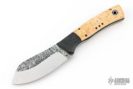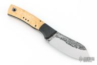 This Fiddleback Forge Camp Nessmuk features a satin finished blade with forge finished flats, .185" blade stock and 1.624" blade depth, full tapered tang construction. The handle has micarta bolsters with integral liners, maple burl covers, micarta pins and lanyard hole. Has a couple spots on the blade, Excellent condition.