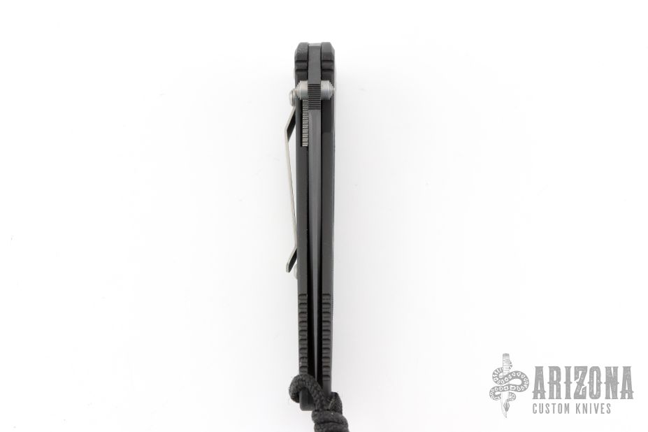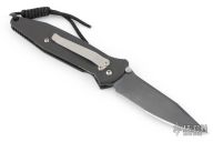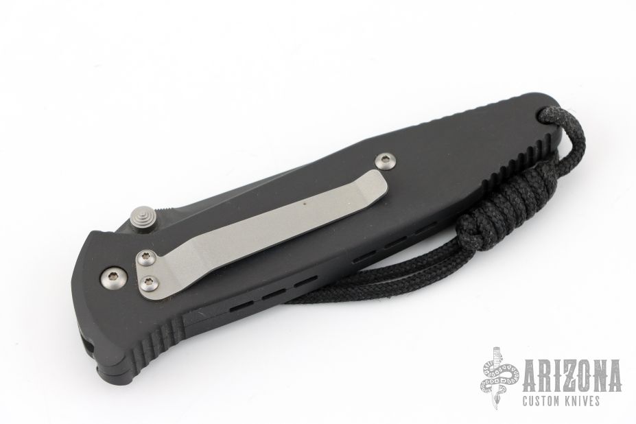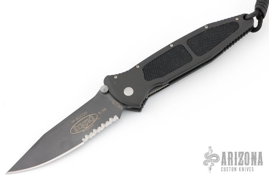 This Mini Socom by Microtech Knives features a black coated clip point blade with partial serrations, swedge and dual thumb studs. Black aluminum frame with nonslip inserts, tip down bead blasted stainless steel clip. Nice lock up and blade seating. Comes with original box, papers and sheath. Excellent condition.
