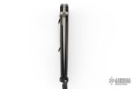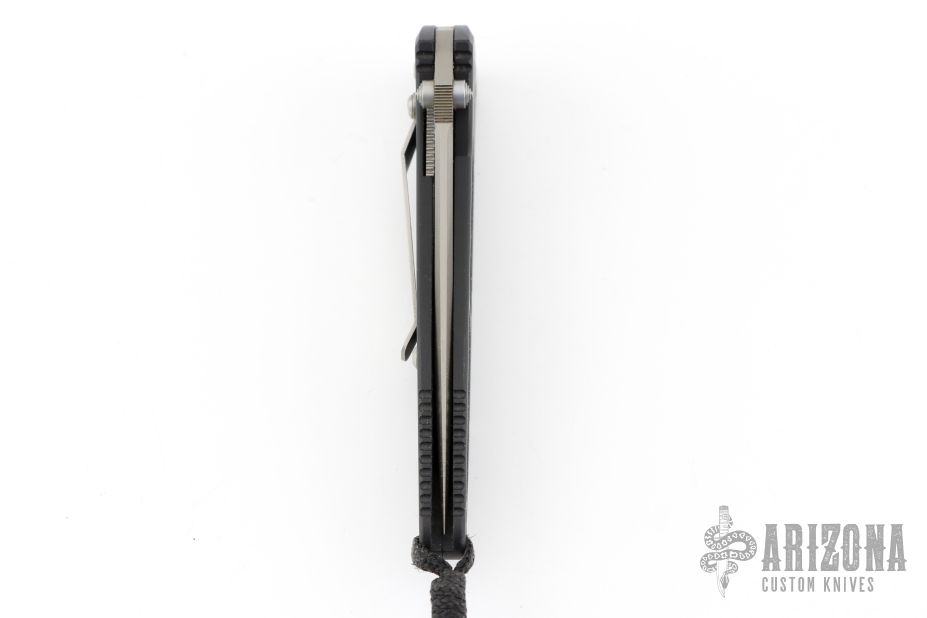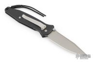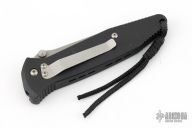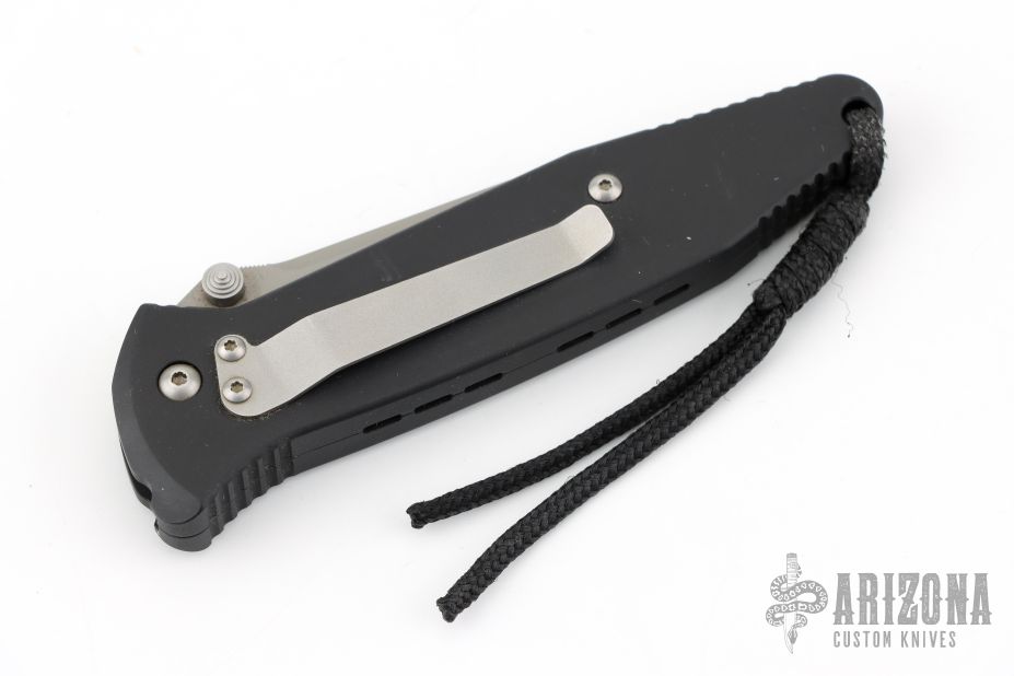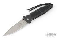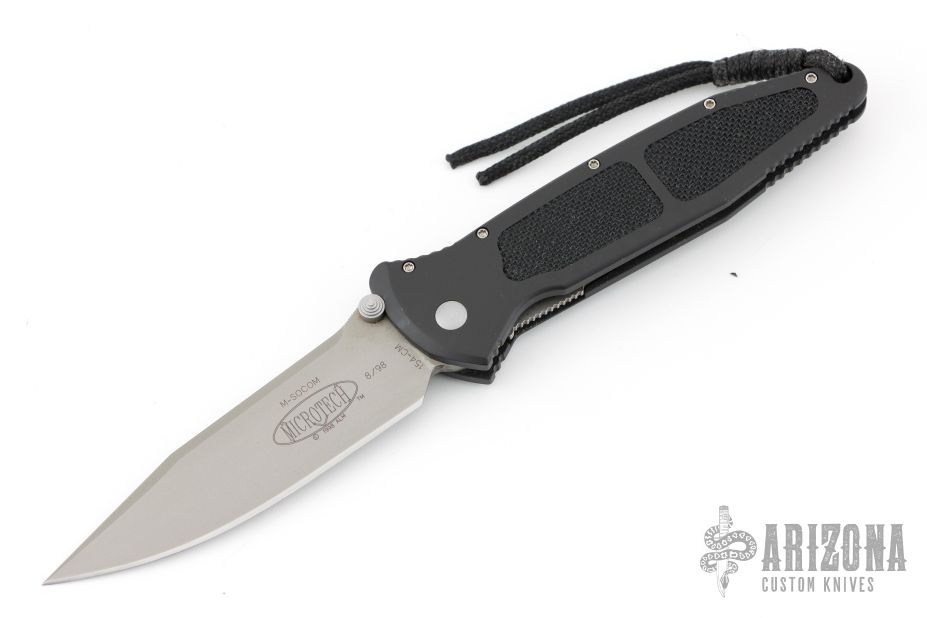 This Mini Socom by Microtech Knives features a silver coated clip point blade with swedge and dual thumb studs. Black aluminum frame with nonslip inserts, tip down bead blasted stainless steel clip. Nice lock up and blade seating. Comes with original box, papers and sheath. Excellent condition.
