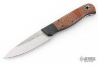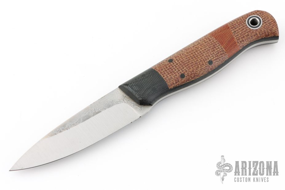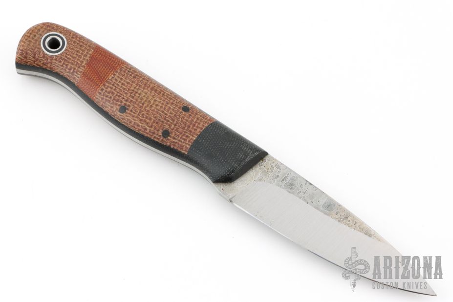This Arete by Fiddleback Forge has a two-tone A2 blade, .125" blade stock and 1.075" blade depth, full tang construction. The handle has dovetailed green canvas micarta bolsters and liners, burlap and brown canvas micarta scales, black micarta pins and a lanyard hole. Has a couple light spots on the blade, excellent condition.