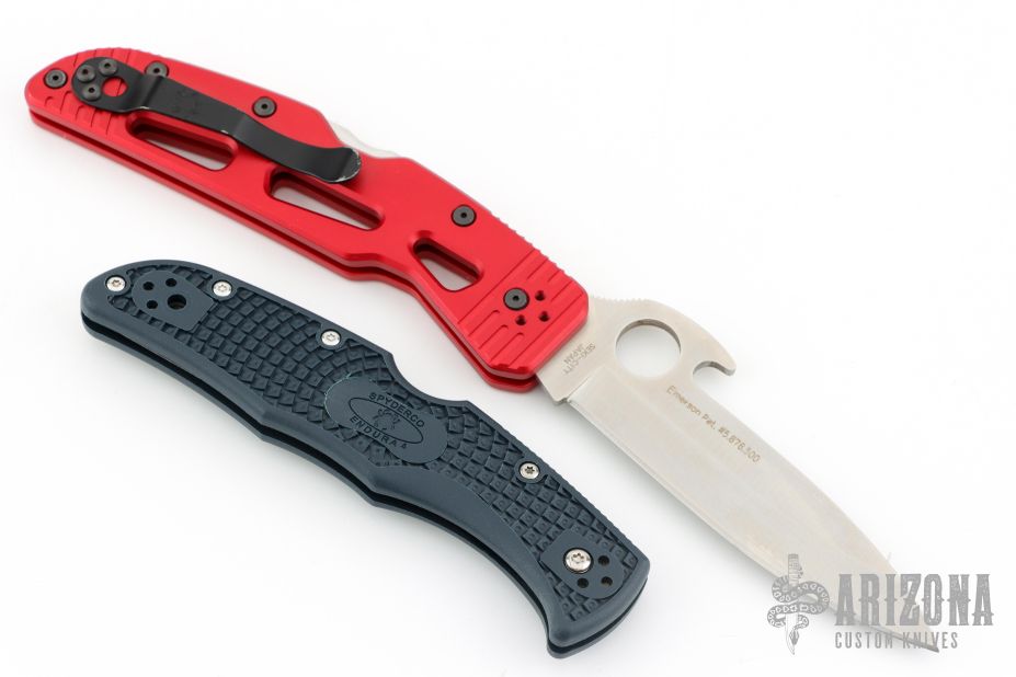 This Spyderco Endura knife has a flat saber-ground VG-10 stainless steel blade with the Emerson Wave opening feature. The handle is blue/gray FRN.