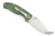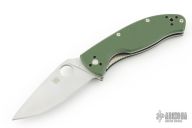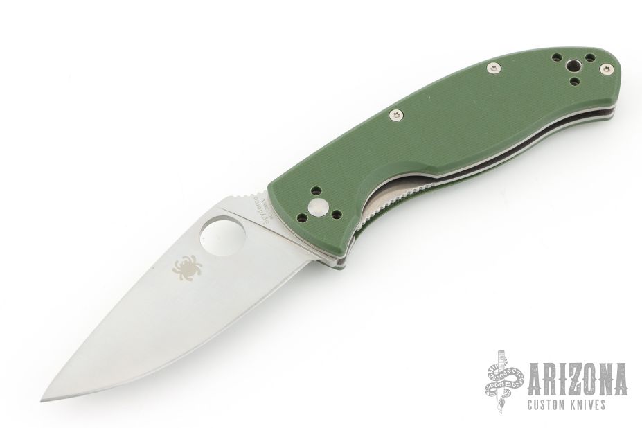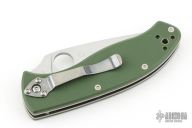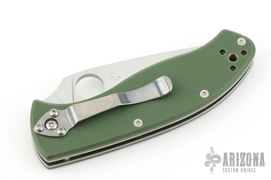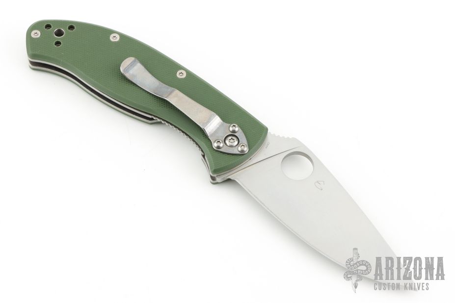 This Spyderco knife features a satin finished drop point blade with thumb hole and notched thumbrest. The handle has green G-10 scales, stainless steel liners, and a 4-way reversible stainless steel clip. Comes with original box and papers. Excellent condition. Blade Steel: 8Cr13MoV