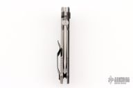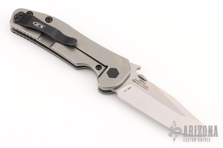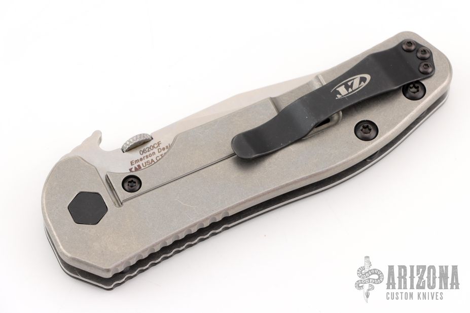 This 0620CF Emerson Tanto by Zero Tolerance features a tanto blade with thumbdisc and wave feature. The handle has a carbon fiber front scale with single stainless steel liner, tumbled titanium lockside, stainless steel lockface insert and a black stainless steel pocket clip. S/N 2693. Comes with original box and papers. Has some scuffs on the clip, Excellent Condition.