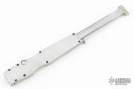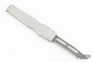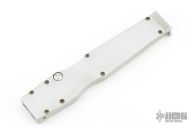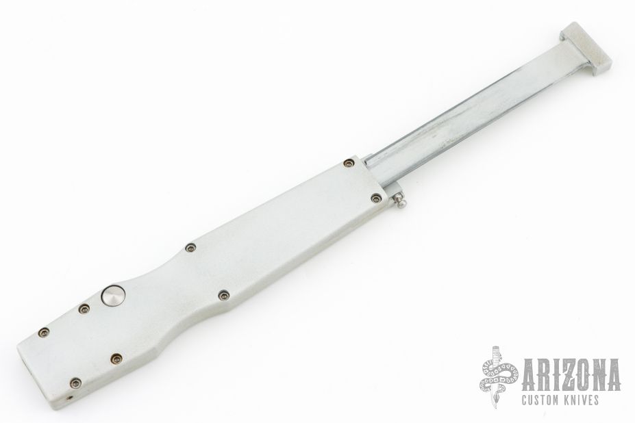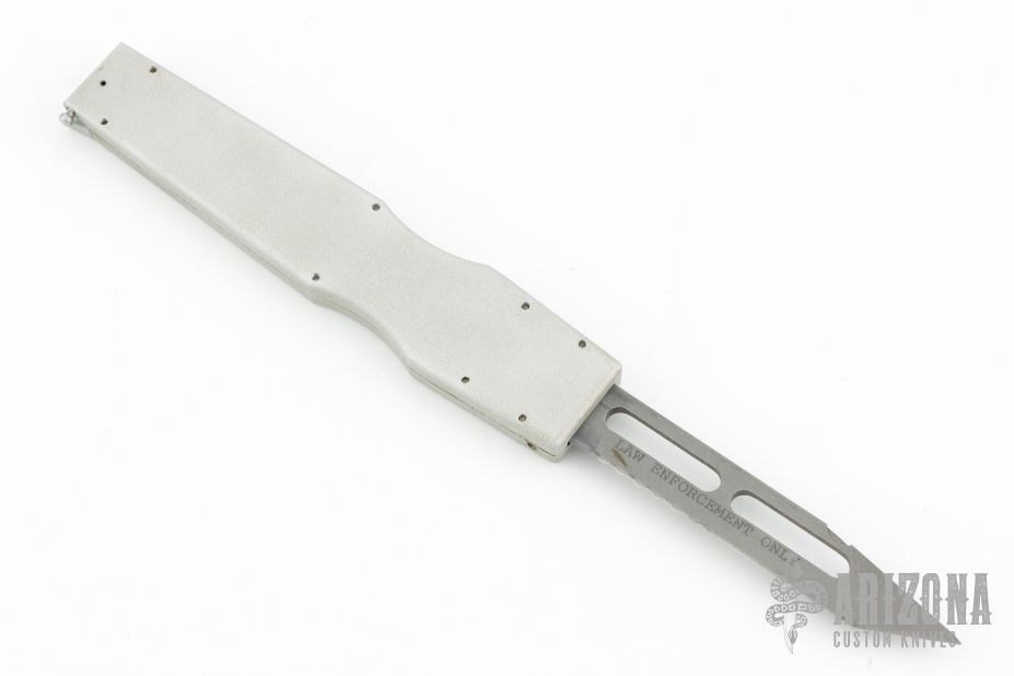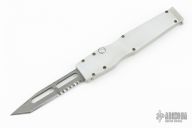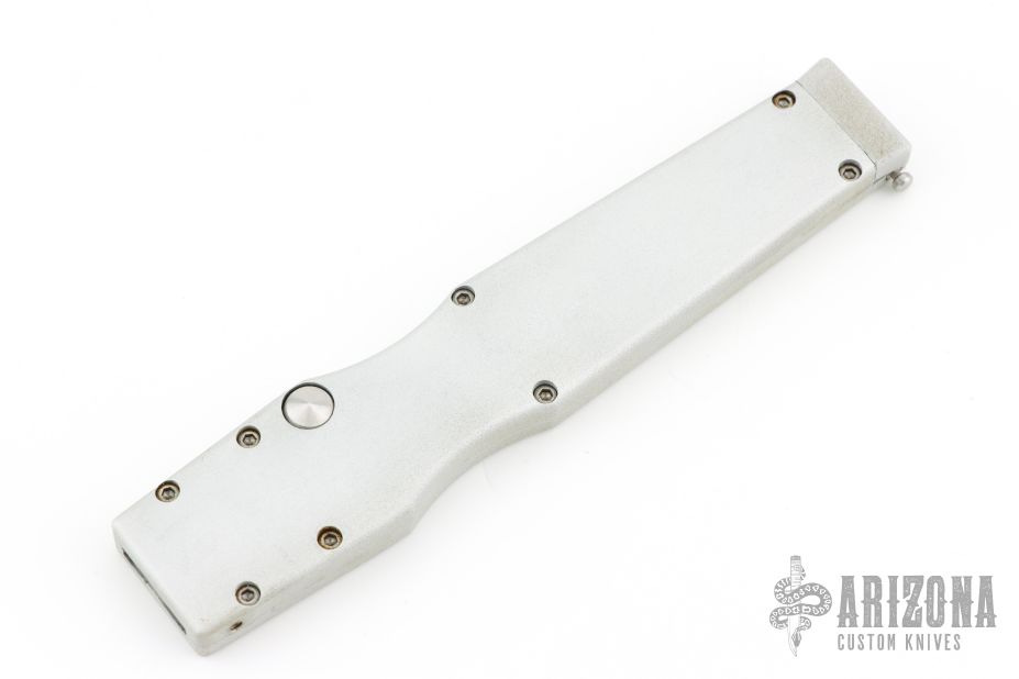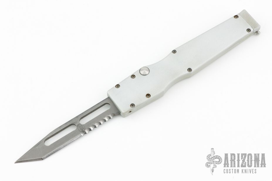 This Ranger OTF Single Action Automatic by Rob Dalton features a bead blasted spear point partially serrated blade. The handle is comprised of silver bead blast finished aluminum with push button and charging handle on pommel. Has some scuffs and scratches, great condition otherwise.