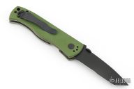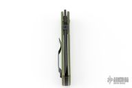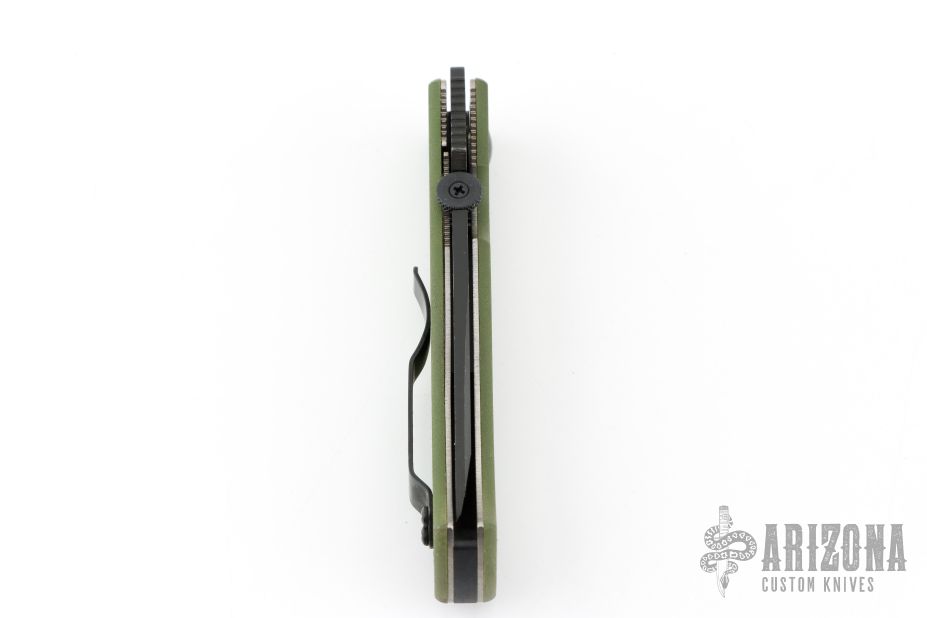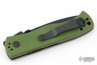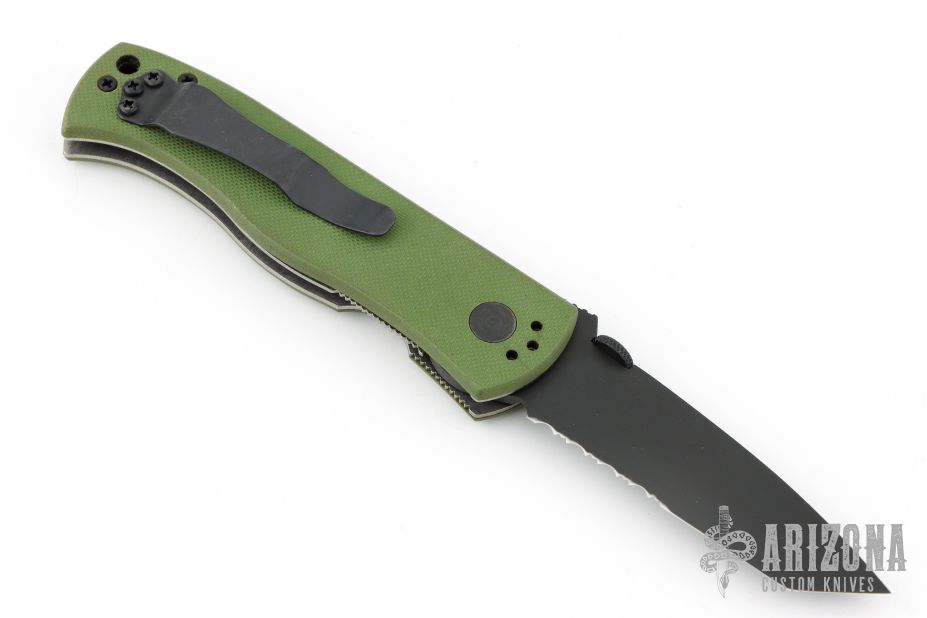 This CQC-7 by Emerson Knives has a black tanto chisel ground partially serrated blade. OD Green G-10 scales, titanium liners, black barrel spacers, milled thumb disk and a tip up black stainless clip. Excellent condition. S/N 2280 and dated 2001.