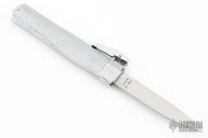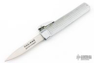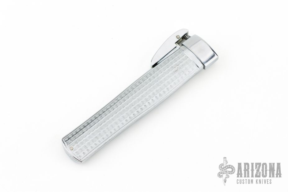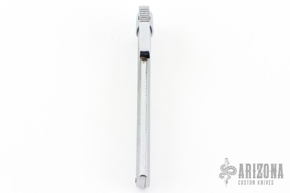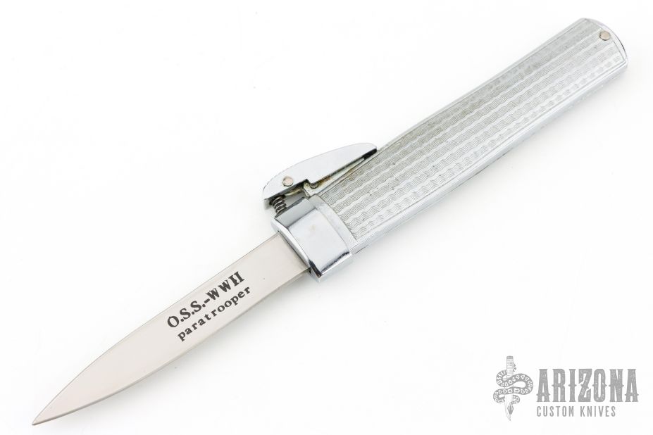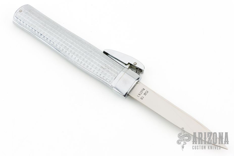This is the Gravity knife sold in the 1980s by The Edge Knife Company. Many recall this discontinued knife and it has become almost impossible to find today. We have come across a number of these from a closed knife store, these are new old stock and are in unused condition. It is a great copy of the Anton Wingen Othello gravity knife, made in Solingen Germany. Enthusiasts have debated whether this was made in Taiwan or Japan. However, we checked with the original exporter of this knife in Japan and found that it was actually made in Seki, Japan in the 1980s. It is all metal construction with chrome finish on handle and the blade is 440 stainless and is factory sharpened. Push the lever and flick the wrist or push with blade pointing down and it slides into the open position. Point blade upward and push the button and it falls into the closed position. Excellent condition.