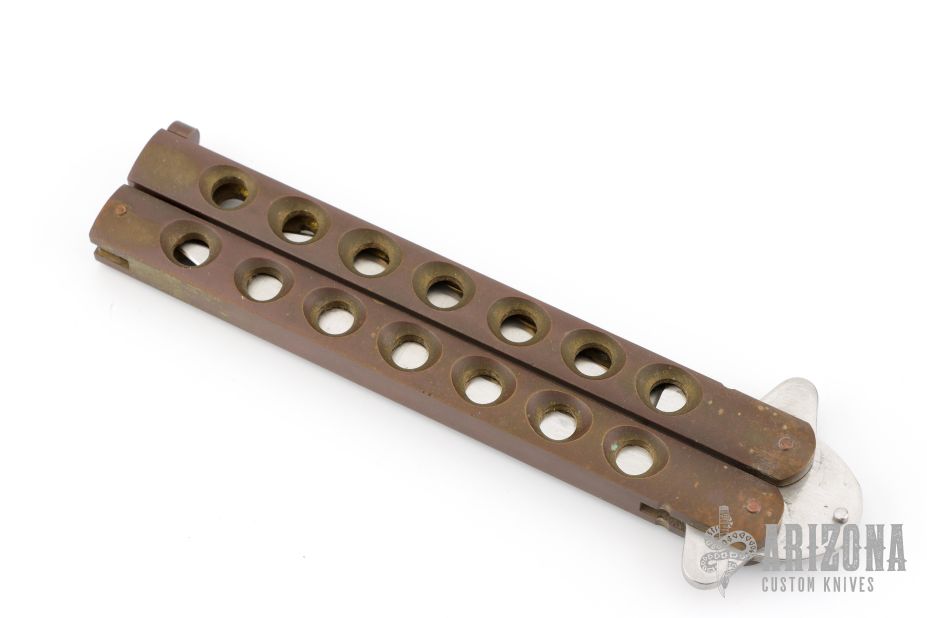 This Golden Dragon is a 1980's classic Taylor/Seto Balisong with brass handles. Has a satin finished blade with a sharpened top edge. Has some light scratches and patina, otherwise excellent condition.