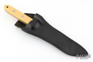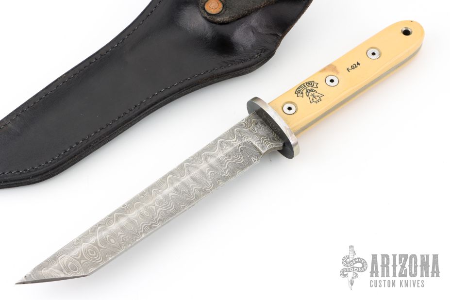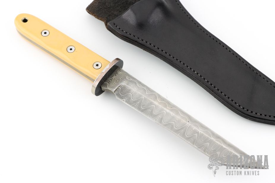 This Battle Cry by Tops Knives features a Damascus blade with false top edge, .181" blade stock and 1.092" blade depth, full tang construction. The handle has an aluminum guard, yellow paper micarta scales. Comes with a black leather sheath. Has some light xcellent condition.