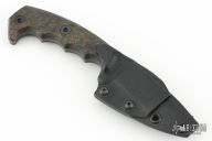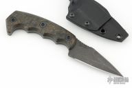 This Humint Dagger by Half Face Blades features a dark acidwashed blade with notched thumbrest, .156" blade stock and 1.155" blade depth, full tang construction. The handle has Gold Laced Dark Matter Carbon Fiber scales. Comes with a suede lined kydex sheath with belt clip. Excellent condition.