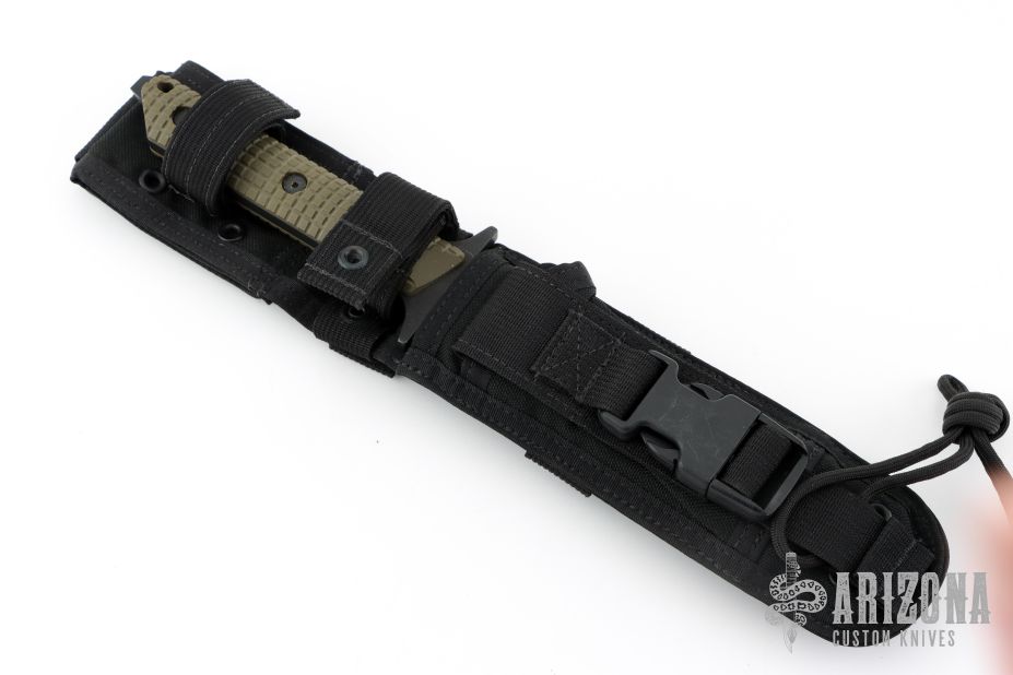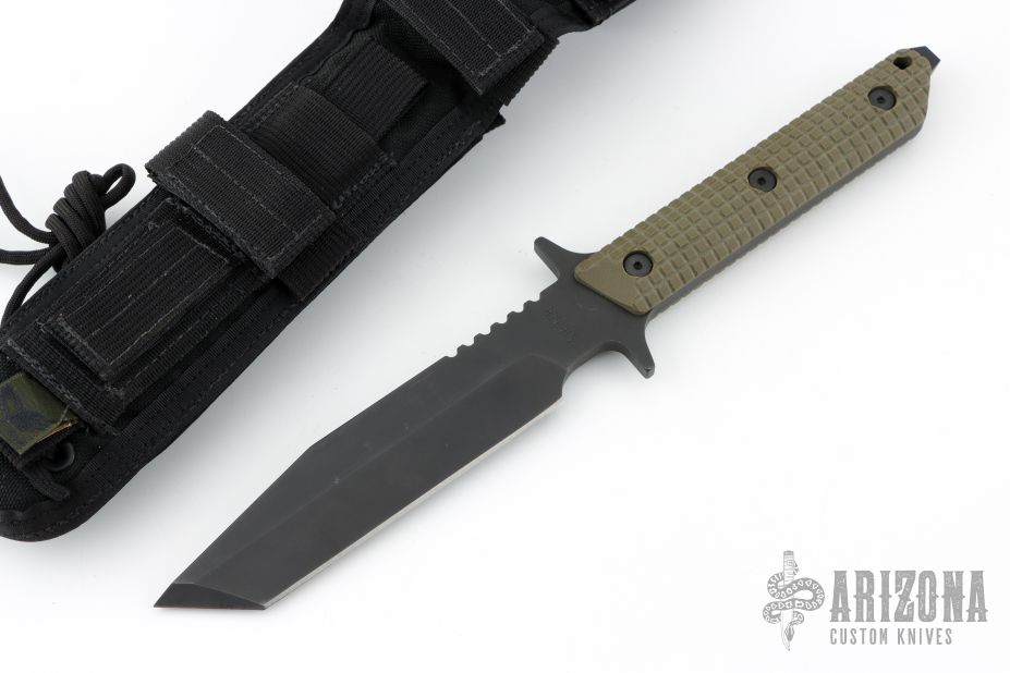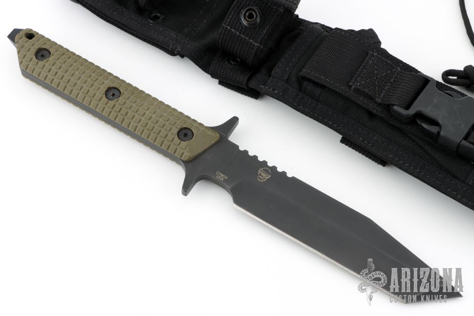 This BT from Mick Strider features a black tanto blade with notched thumbrest, .252" blade stock and 1.313" blade depth, full tang construction. The handle has green MEFP scales with a lanyard hole and prybar at the butt. Includes nylon sheath with belt loop. Has a few light scuffs, otherwise excellent condition.