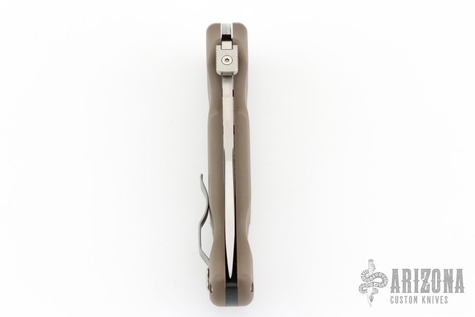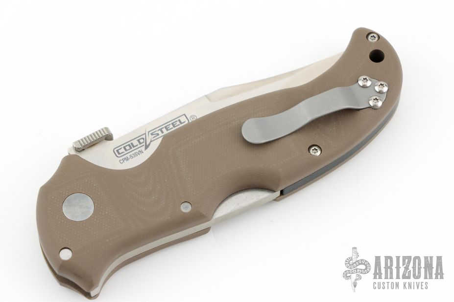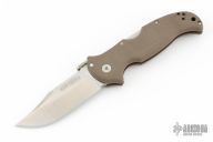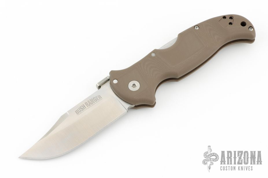 The Bush Ranger by Cold Steel, features a satin finished clip point blade.  The handle has a brown G10 frame with a stainless steel backspacker and tip up pocket clip.  Includes the original box. Has a couple light scuffs, otherwise Excellent Condition.
