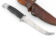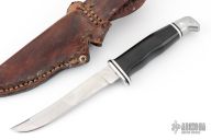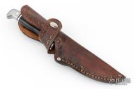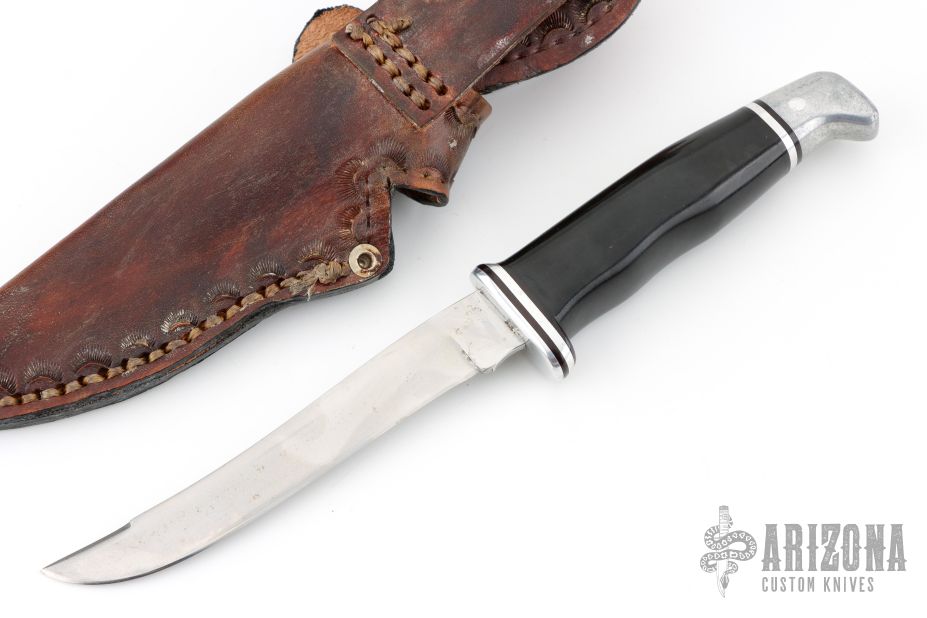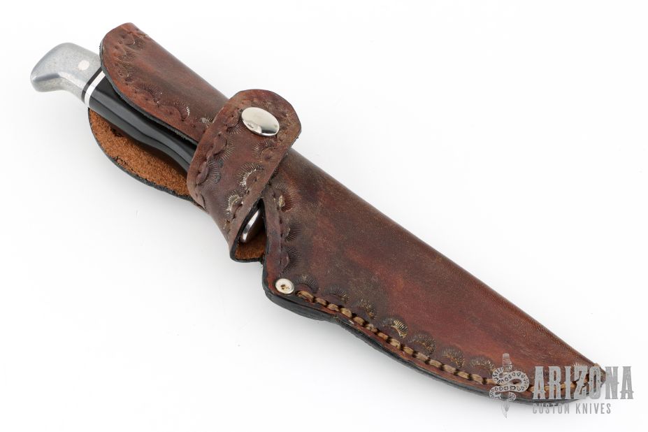 The Buck Pathfinder Pro is a classic heavy-duty fixed blade for all-purpose use. This smaller model is perfect for everyday carry and general outdoor use. The Pathfinder features full tang construction, a finger guard, thumb grip ridges and a deep choil. Made in the USA. Satin finished blade, .117" blade stock and .777" blade depth, hidden tang construction. The handle has an aluminum guard and butt, black grip. Comes with a brown leather sheath (not original, but fits). Has some scratches and patina, otherwise good user condition.