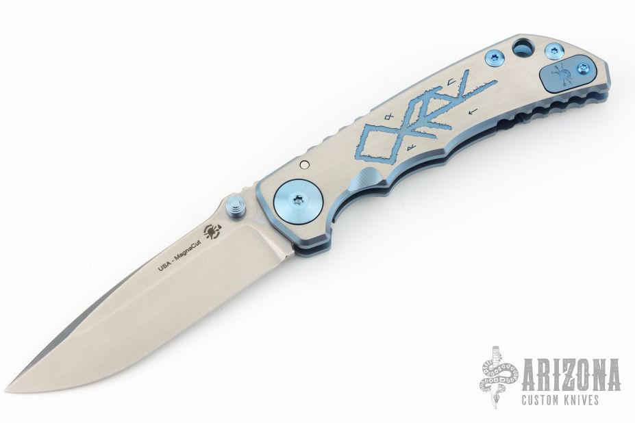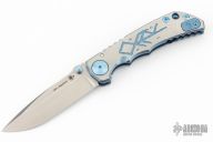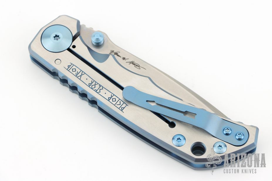 This Harsey framelock folder by Spartan Blades features a stonewashed drop point Magnacut blade with dual thumbstuds and a notched thumbrest. The handle has an anodized titanium frame with a laser engraving a tip up titanium clip and filler tab. Has nice detent, lockup, and blade seating. Comes with original box and COA dated December 19, 2024. Excellent condition.