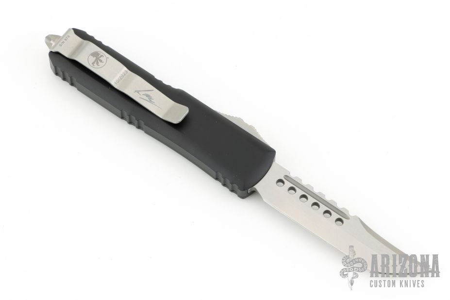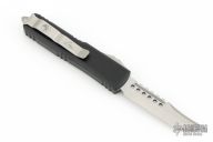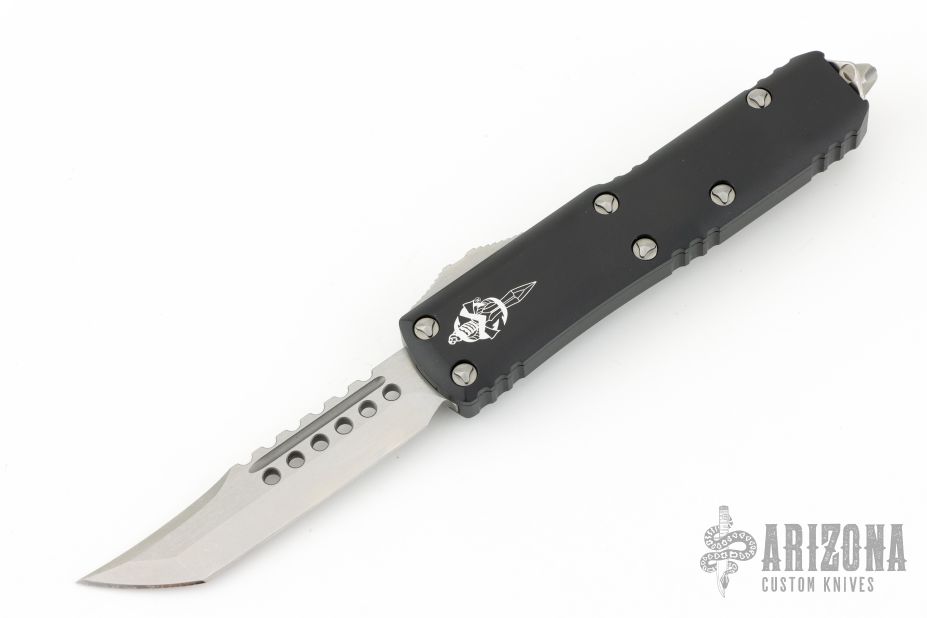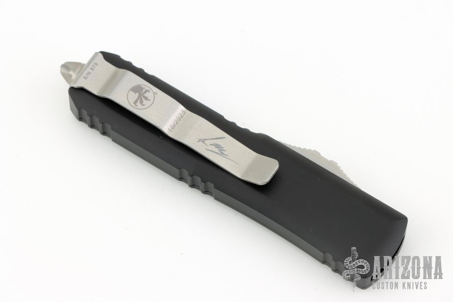 This UTX-85 OTF automatic by Microtech knives features a D/E stonewashed Hellhound blade, and a black aluminum handle with blasted hardware, tip down carry. Glass breaker. S/N 878. Dated 10/2023. Comes with original box and papers. Excellent condition.