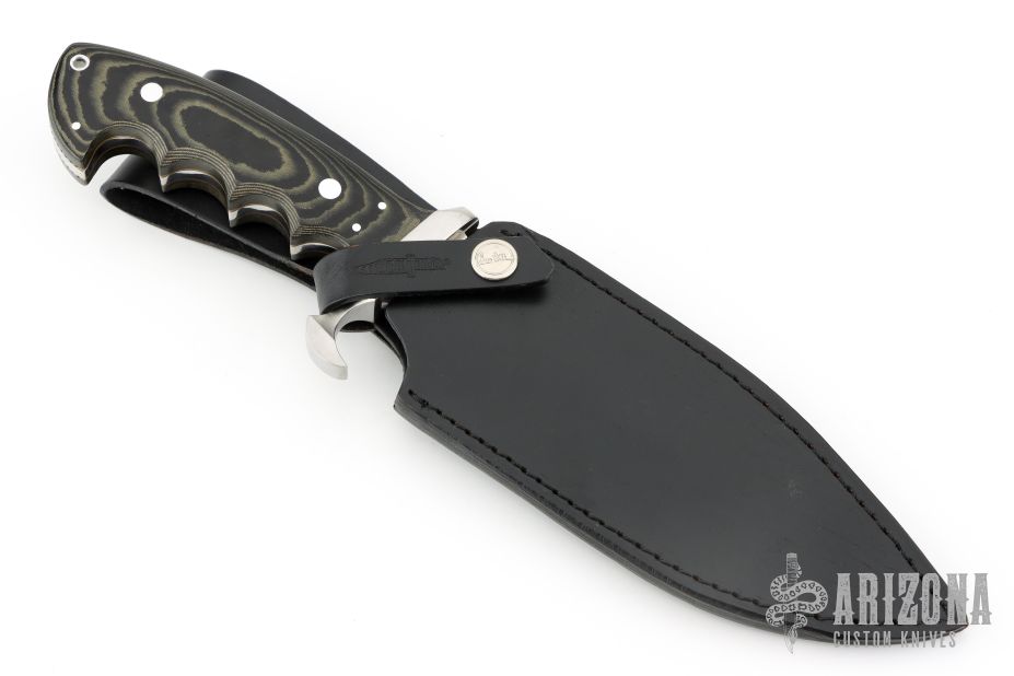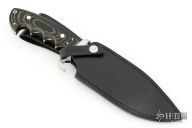 This Hibben Alaskan Survival Knife by United Cutlery features a satin finished blade with a false top edge, .207" blade stock and 1.899" blade depth, full tang construction. The handle has a stainless steel guard, black linen micarta scales with fileworked brass liners. Comes with original box and black leather sheath. Has some light scratches, otherwise excellent condition.