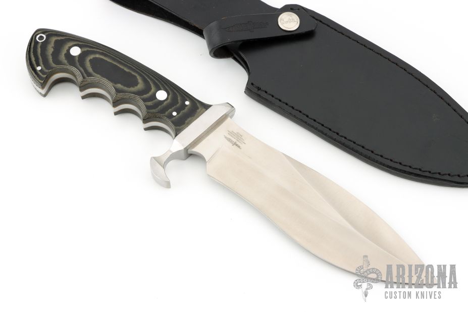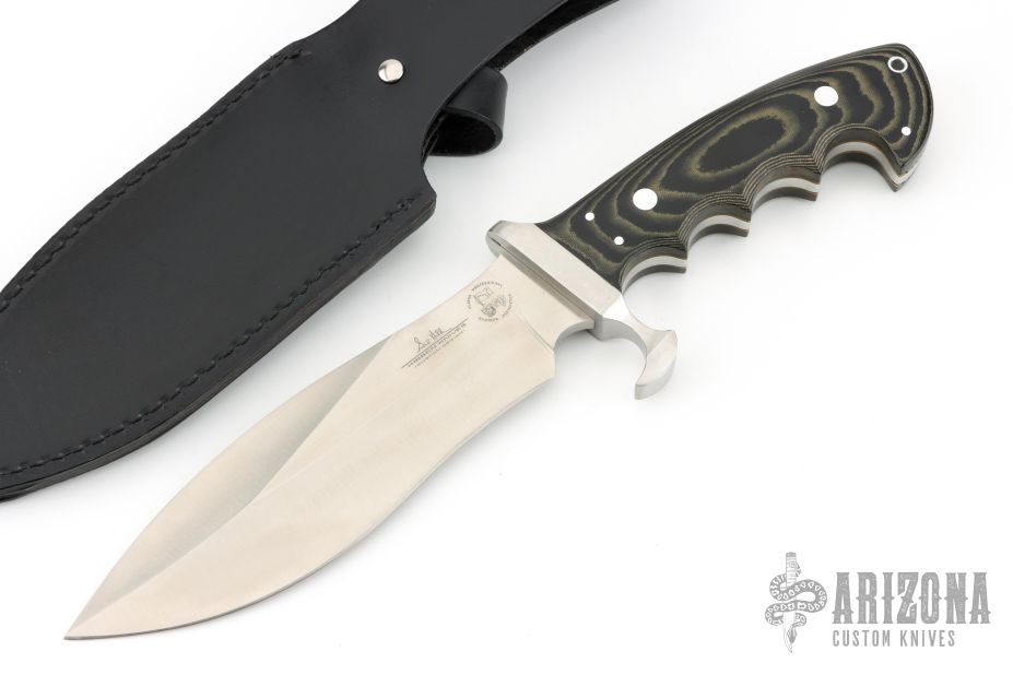 Gil Hibben lives and works in LaGrange, Kentucky. He began making knives part-time after his discharge from the Navy in 1956. He sold his first bowie knife for $45 and that sparked his long and famous career as a professional knife maker. While living in Seattle, WA after his Navy discharge, Gil worked as a machinist for Boeing Aircraft and learned a lot about metals and their properties. In 1964, while living in Salt Lake City, Utah, Gil started making knives full time. This was also the year Gil started making knives from the relatively new 440C steel. Although it is the industry standard now, Gil believes he was the first custom knife maker to use 440C. Hibben has been a full time custom knifemaker since 1957. Over the years Gil achieved fame as a premier custom knife maker and his work has been featured in, and on the covers of, national gun and knife magazines. He has established a whos-who following of collectors including John Wayne, Elvis Presley, Steve McQueen, Sylvester Stallone and Steven Segal or world leaders such as Israel's Defense Minister Moshe Dayan, the Sultan of Brunei and Vice-President Dan Quayle. He has taught and influenced some of the other legendary knife makers such as S.R. Johnson, Harvey Draper and Buster Warenski among countless others. Hibben designed the first line of Browning hunting knives in 1968, the American Kenpo Knife for Ed Parker. Gil's fame dramatically increased in 1988 when Sylvester Stallone, who had purchased several of Gil's custom knives for his own collection, asked Gil to design the now famous knife used in the movie Rambo III. Inducted into the Blade Magazine Cutlery Hall of Fame in 1990.