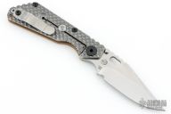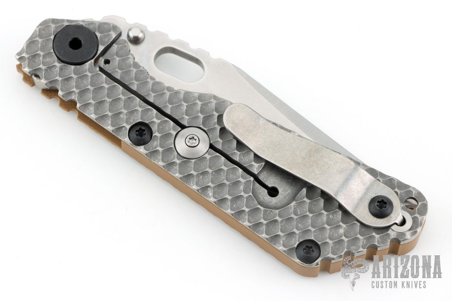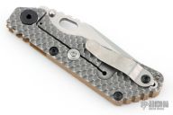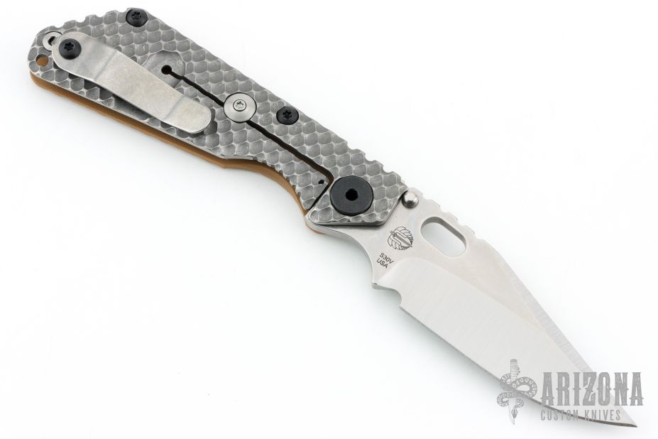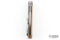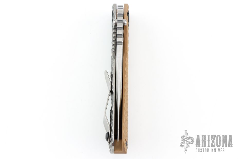 This SNG DGG by Strider has a satin/stonewash finished Bowie blade with dual thumb studs, thumb hole, and notched thumb rest. Handle has a coyote G-10 and bead blasted titanium "Gunner Grip", lockbar stabilizer, and titanium tip up clip. Nice detent, lockup and blade seating.  New Conditon.