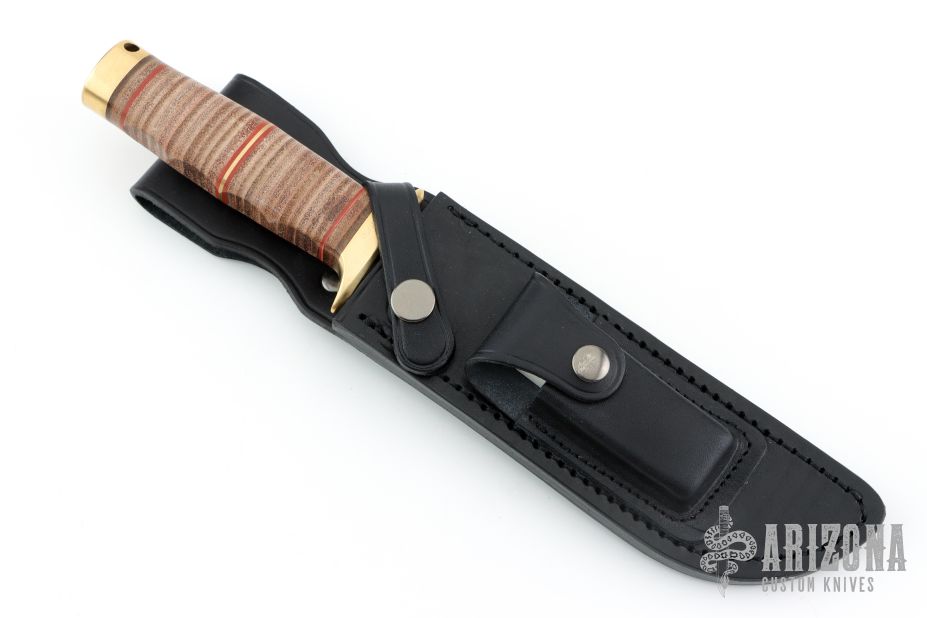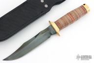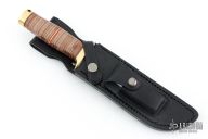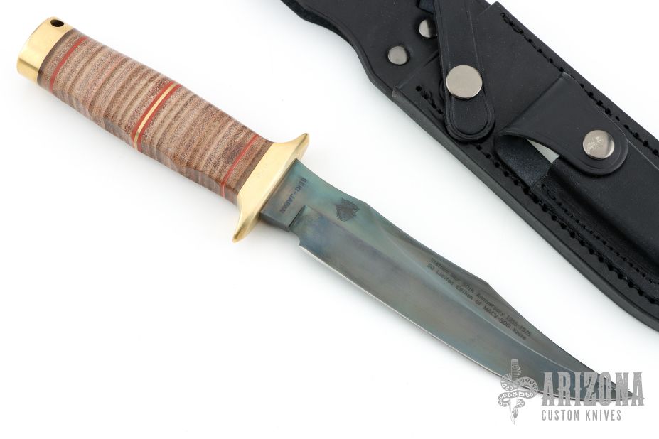 Master Hattori has reproduced 50 special limited Anniversary knives, and just came up in right time of the 50th Anniversary year and month. It features original 6-1/4" Hollow ground Gunblued SK-5 carbon steel Bowie blade etched with "Vietnam War 50th Anniversary 1955-1975" and "50 Limited Edition of MACV-SOG Knife" on blade, and "De Oppresso" Special Forces Crest on tang. Each serial number is engraved on the bolster. The stacked Leather handle has Red Fiber & Gold Brass spacers (Vietnam flag colors) and solid Brass bolster & butt end.