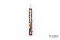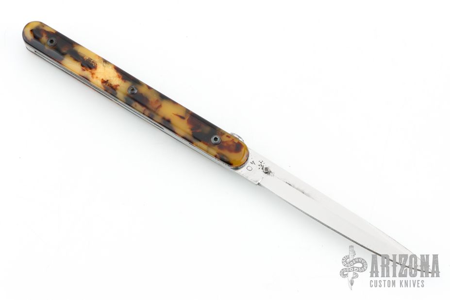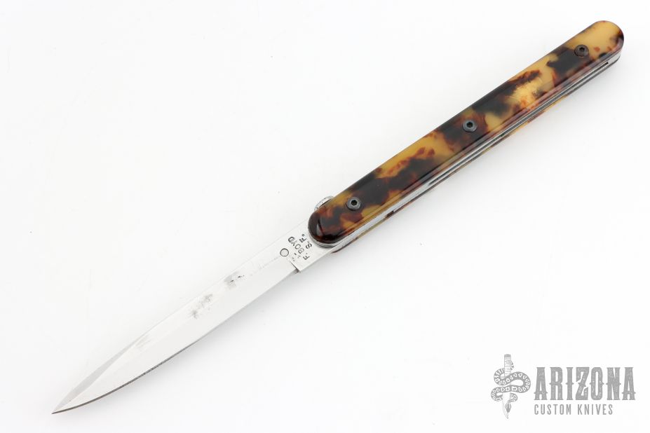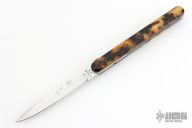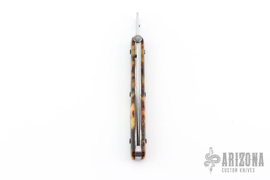 This knife by Francis Boyd features a satin finished blade with thumbdisc. The handle has faux tortoise shell scales over stainless steel liners and backspacer. Includes a padded zippered case. Has some light scratches and oxidation on the liners, has some cracks in the scales, otherwise good condition.