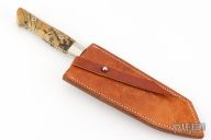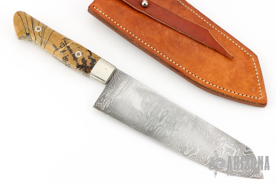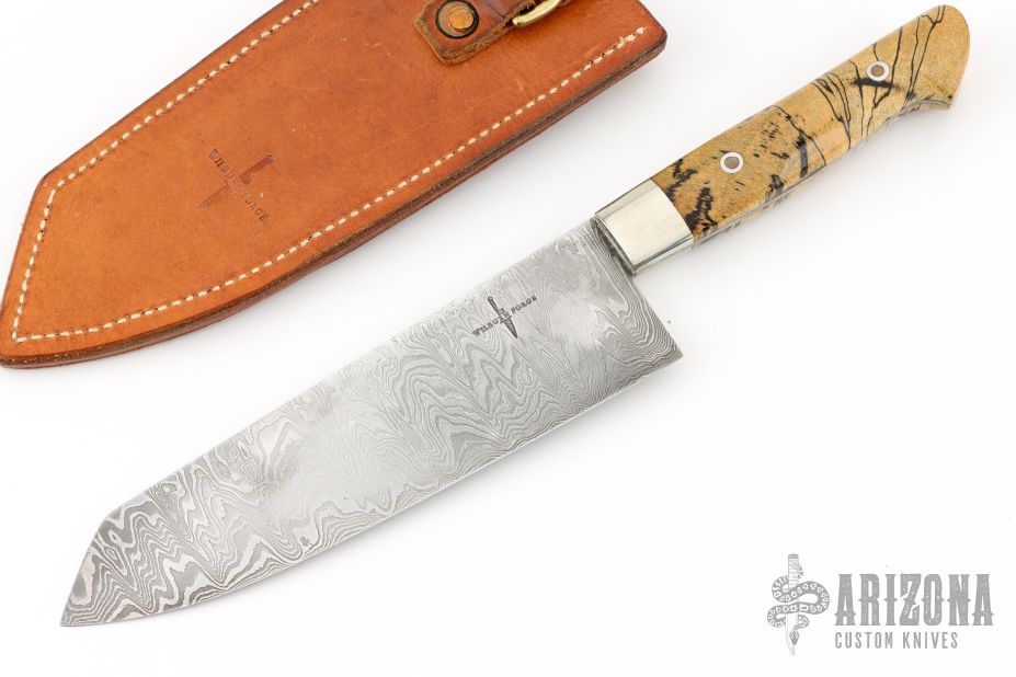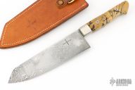 This Chef's Knife by Master Smith Aaron Wilburn features a Damascus blade with .090" blade stock and 1.924" blade depth, full tang construction. The handle has nickel silver bolsters, spalted wood scales. Comes with a brown leather sheath. Excellent condition. Comes with a zippered case.