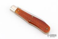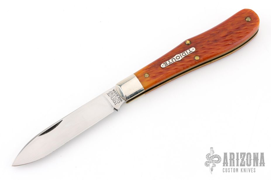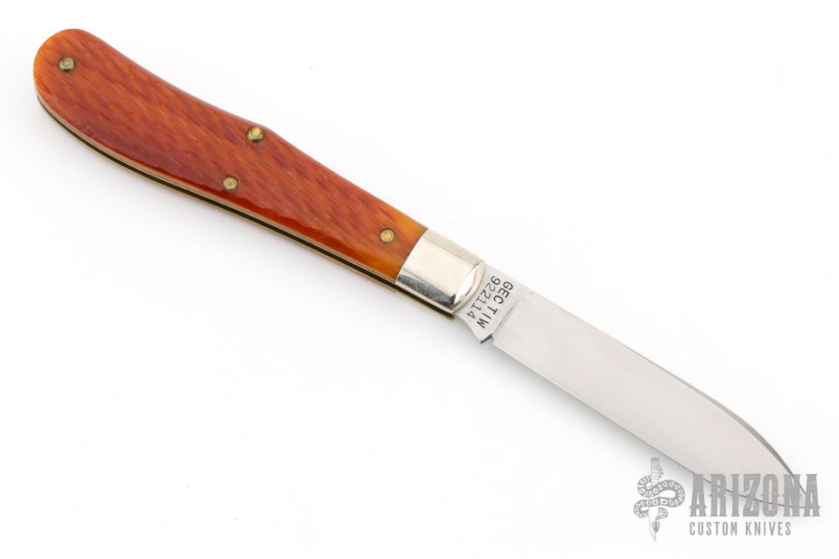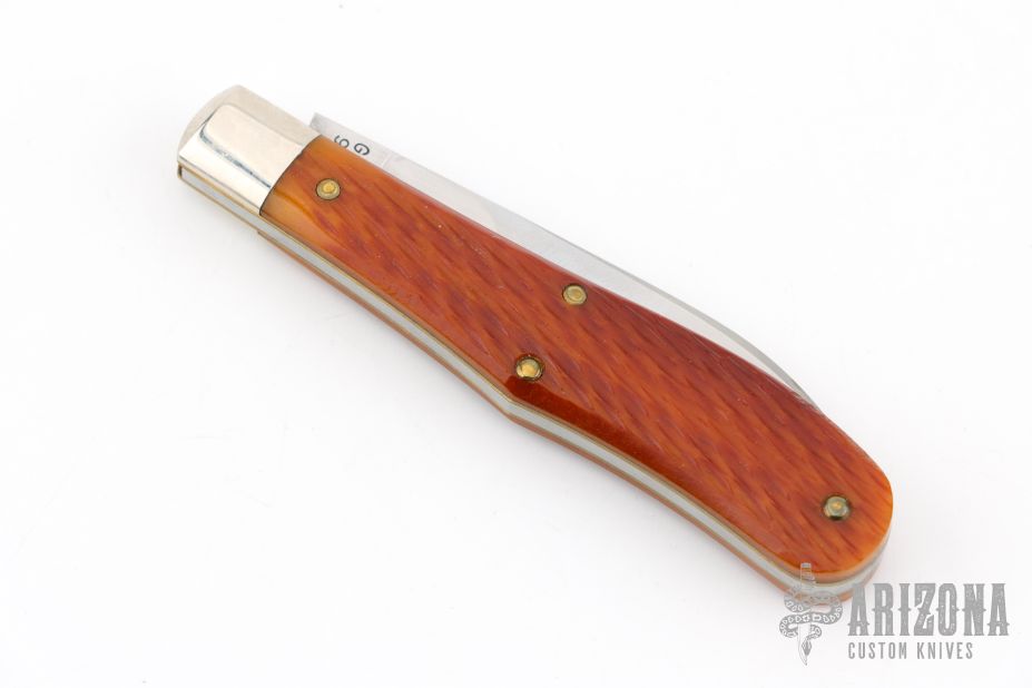 This knife by Great Eastern Cutlery features a polished blade with a nail nick.  The handle has nickel silver bolsters with goldenrod jigged bone covers with nickel silver escutcheon, brass liners, steel spring.  Comes with original tube. Excellent condition. 52 were made.