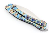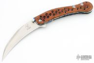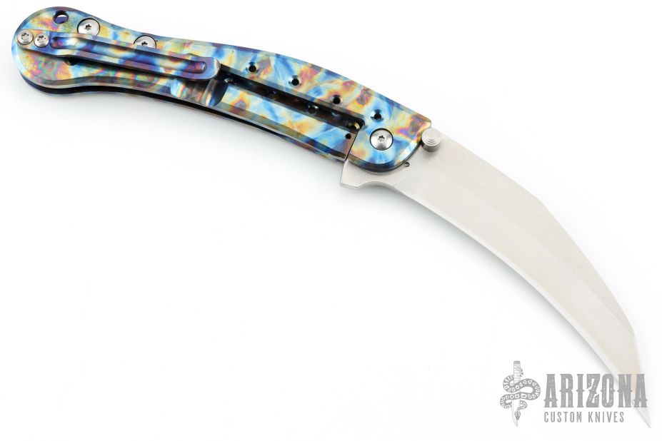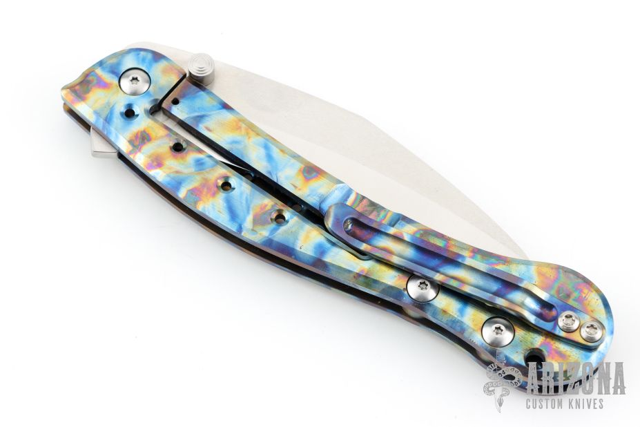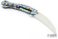 This Angry Bird Flipper by Steve Ryan features a saw finished blade with dual thumbstuds and flipper. The handle has a flame anodized titanium frame with a richlite scale, tip up titanium clip. Nice detent, lockup and blade seating. Excellent condition