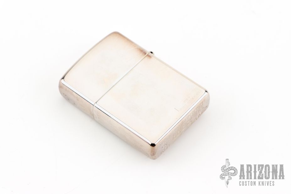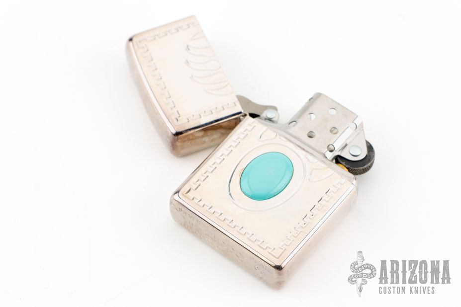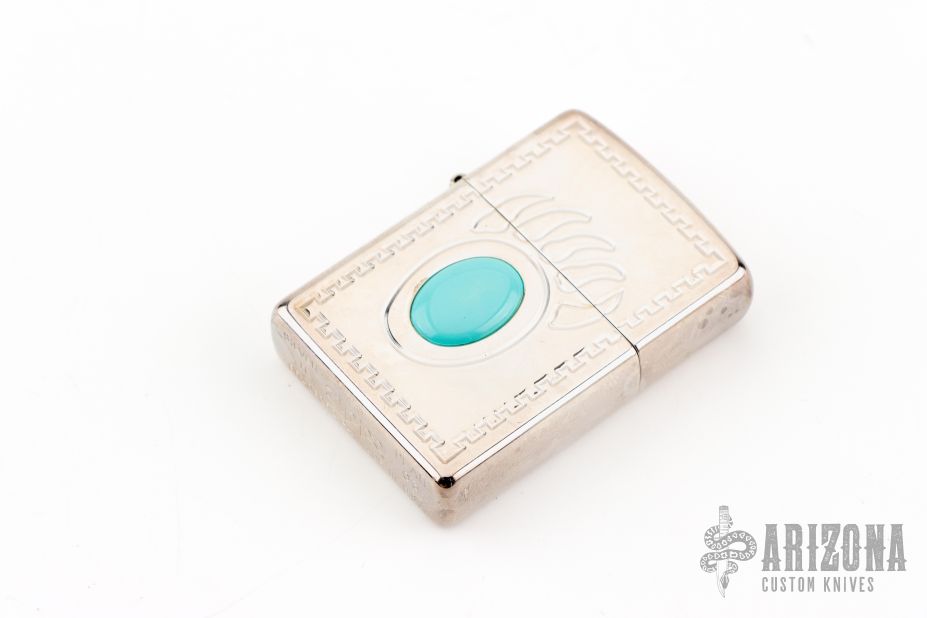 This Z---o (can't say the name or they will send us a cease and deist letter, its already happened once, you think they would appreciate the free publicity, but I guess not...) is made of a .925 heavy silver plated body with bear claw engraving and turquoise inlay. Comes with original box and papers. Excellent condition.