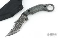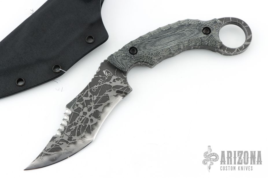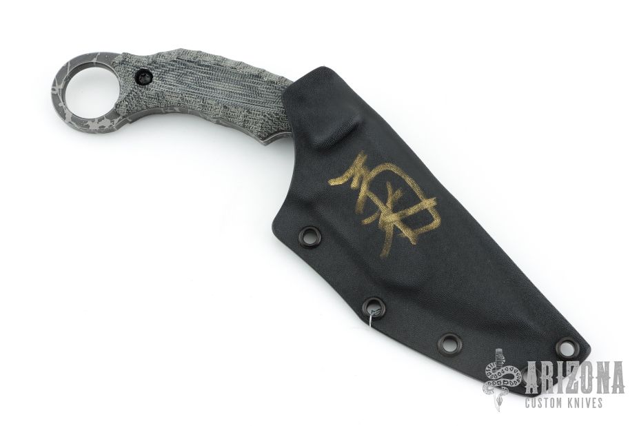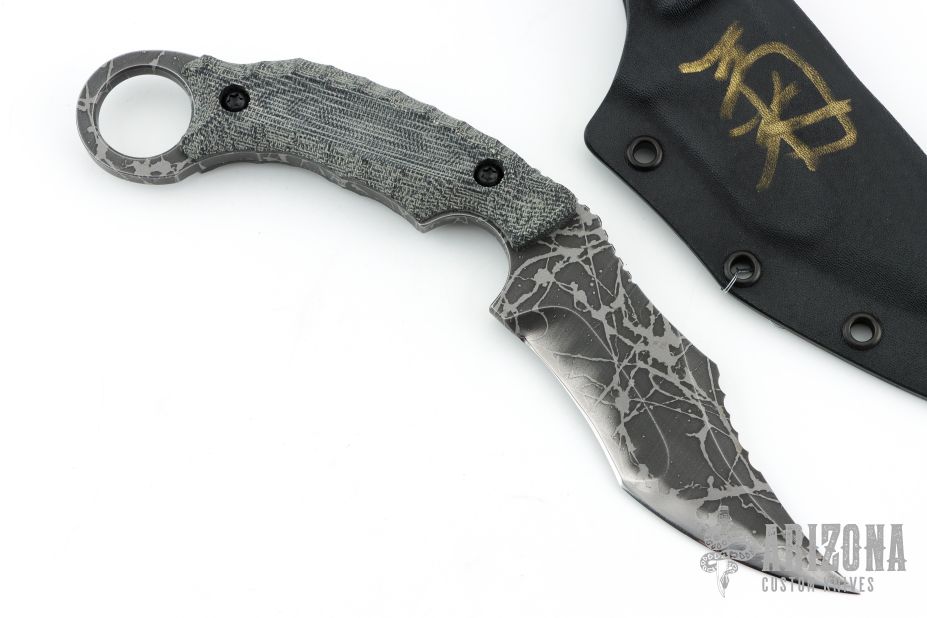 This Karambit by Kiku Matsuda features an acid etched blade with partially serrated top edge and notched thumbrest, .223" blade stock and 1.440" blade depth, full tang construction. The handle has black canvas micarta scales. Comes with kydex sheath that is signed by the maker. New condition.