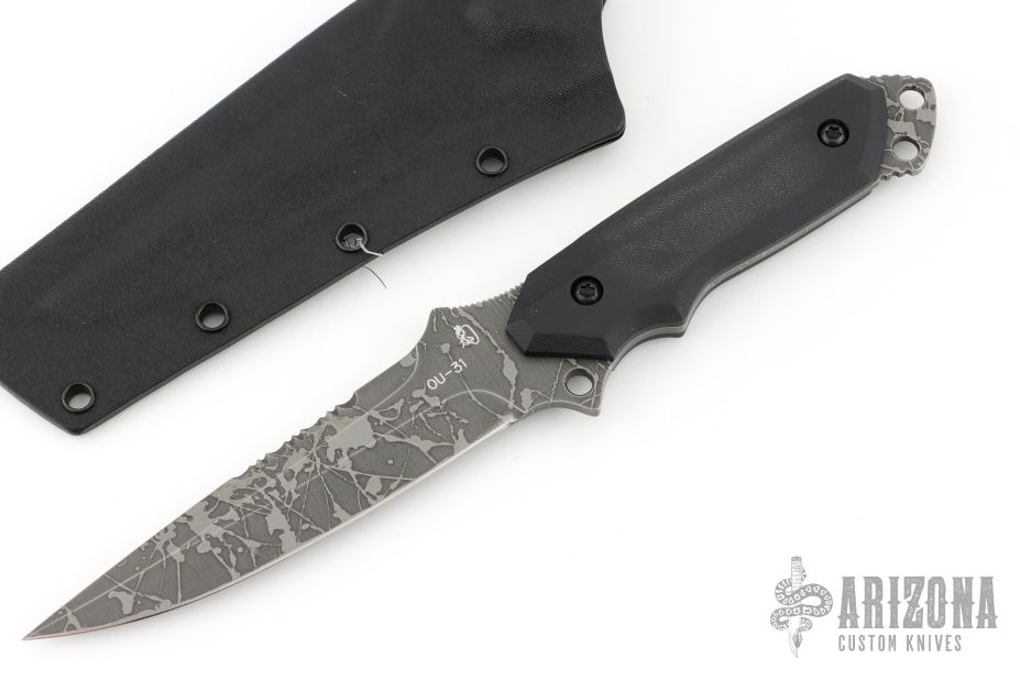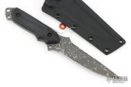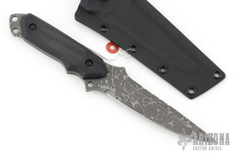This knife by Kiku Matsuda features an acid etched blade with false top edge with serrations, and a notched thumbrest, .163" blade thickness and 1.360" blade depth, full tang construction. The handle has black G-10 scales. Comes with kydex sheath. New condition.