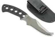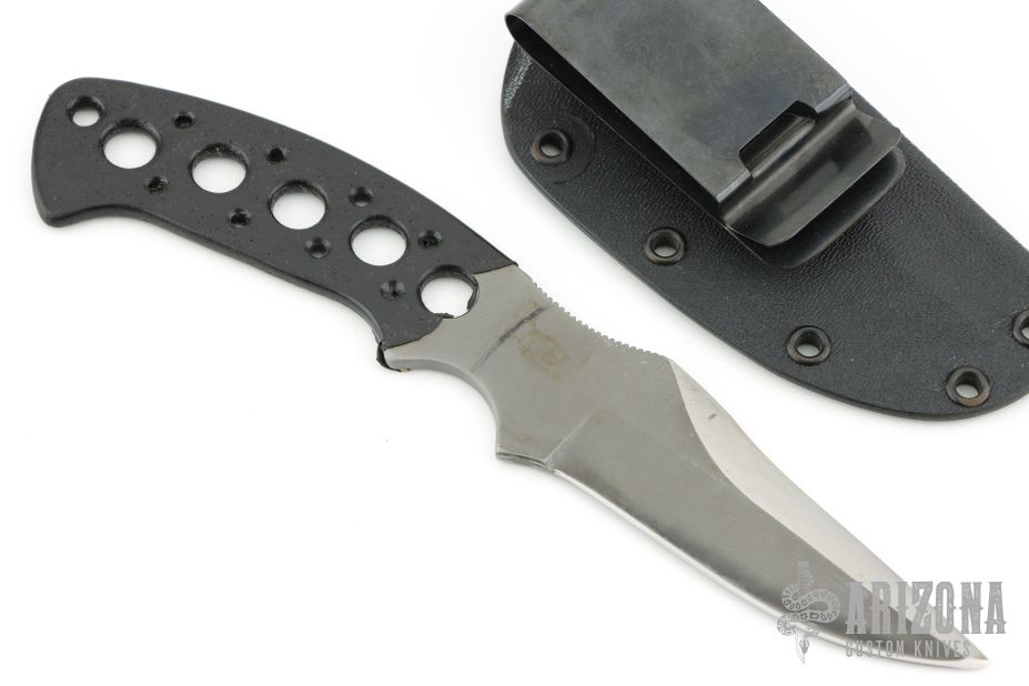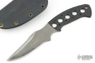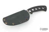 This Kasper Neck Knife from Pat and Wes Crawford features a bead blasted clip point blade with false top edge and notched thumbrest, .129" blade stock and 1.119" blade depth, full tang construction. Handle has been drilled to reduce weight for ease of carry. Comes with a Kydex sheath. The blade has been reground with satin false top edge. Has scuffs and scratches, good condition otherwise.