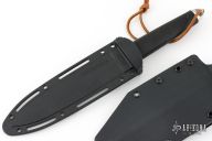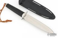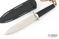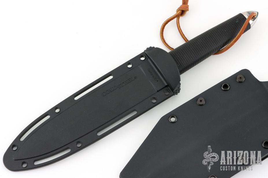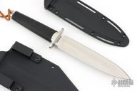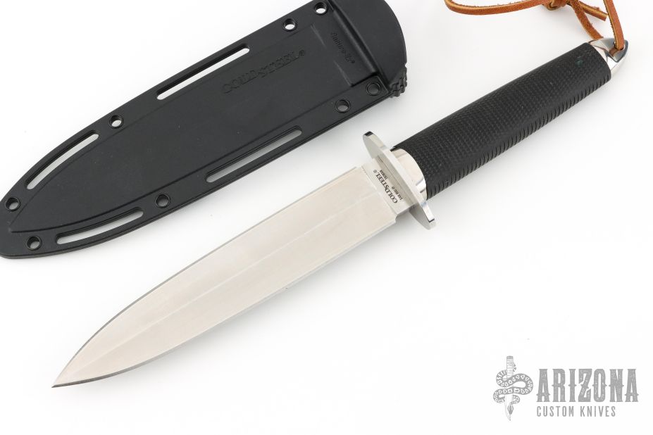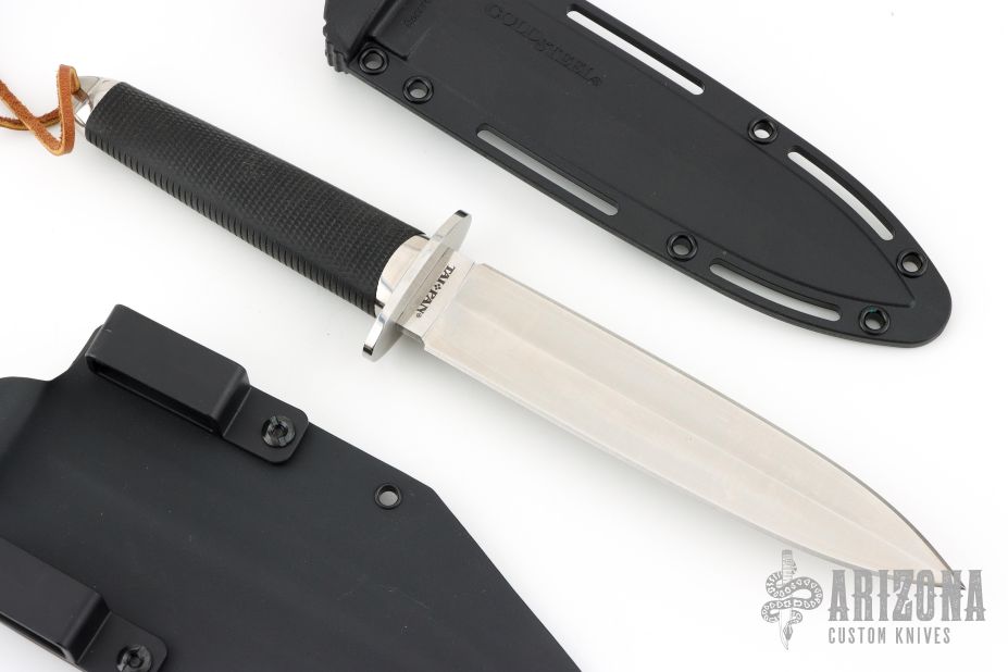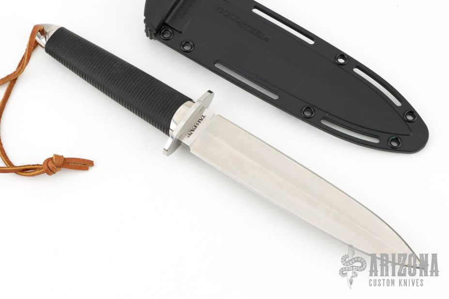 This Tai Pan from Cold Steel features a satin finished double-edged blade, .199" blade stock and 1.378" blade depth, hidden tang construction. The handle has a stainless steel guard and pommel, and rubber grip. Comes with original Secure-Ex sheath and a custom Kydex sheath. Has some light scratches, otherwise excellent condition.