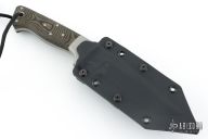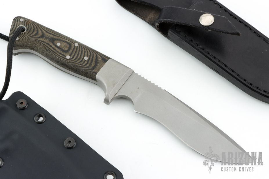 This knife by WC Johnson features a bead blasted recurve blade with notched thumbrest and false top edge, .201" blade thickness and 1.292" blade depth, full tang construction. The handle has bead blasted and dovetailed 303 Stainless Steel bolsters, black linen micarta scales. Great feel in the hand. Very nice work. Comes with a black leather sheath and a custom Kydex sheath. Excellent condition.