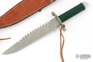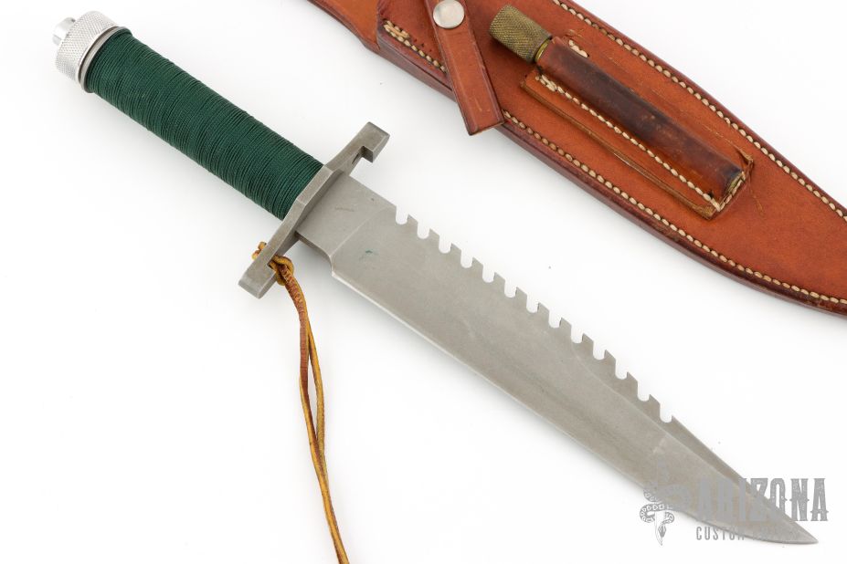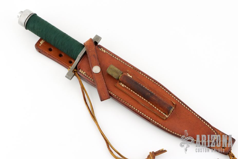 This knife has a 9" blade with 12 saw teeth (8 double split teeth and 4 single), .239" blade thickness and 1.482" blade depth. The stainless steel handle is waterproof, cord wrapped, and hollow. The aluminum butt cap unscrews to reveal a compass, and allows you to use the hollow handle for storage. Comes with a brown leather sheath with sharpening steel made by "Johnson Sheathery". Has some scuffs, otherwise excellent condition.