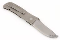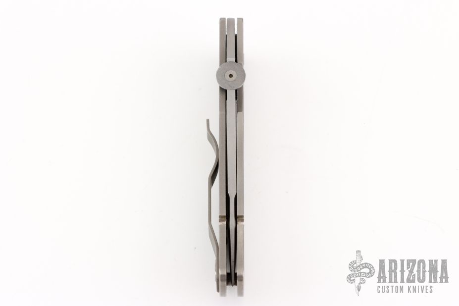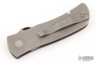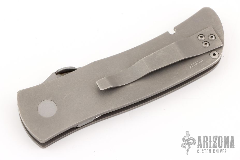 This tactical folder is a liner lock in function with a unique spring design which Les calls a pocket lock. The liner spring is fully seated within the side of the frame making it a sealed unit in both the open and closed positions, which prevents debris from jamming the lock mechanism. The blade receives two temper cycles, is heat treated and cryoed in liquid nitrogen and Rockwell tested to assure a successful heat treat. The pivot and stop pins are heat treated and tungsten carbide detent balls are used. Bead blast finish on blade, frame, and all fittings. All work is done by Les. This Model TF has the insignia of Les' South Florida Bomb Group on the face side of the handle. Has some scuffs, scratches, and rust on the blade. Good condition otherwise.