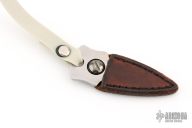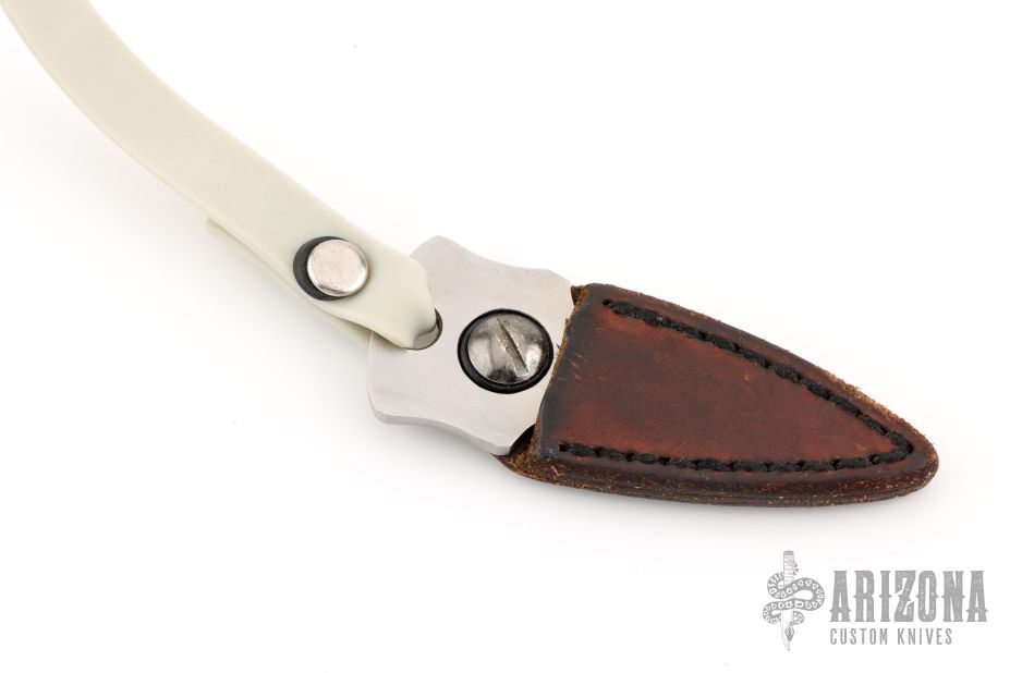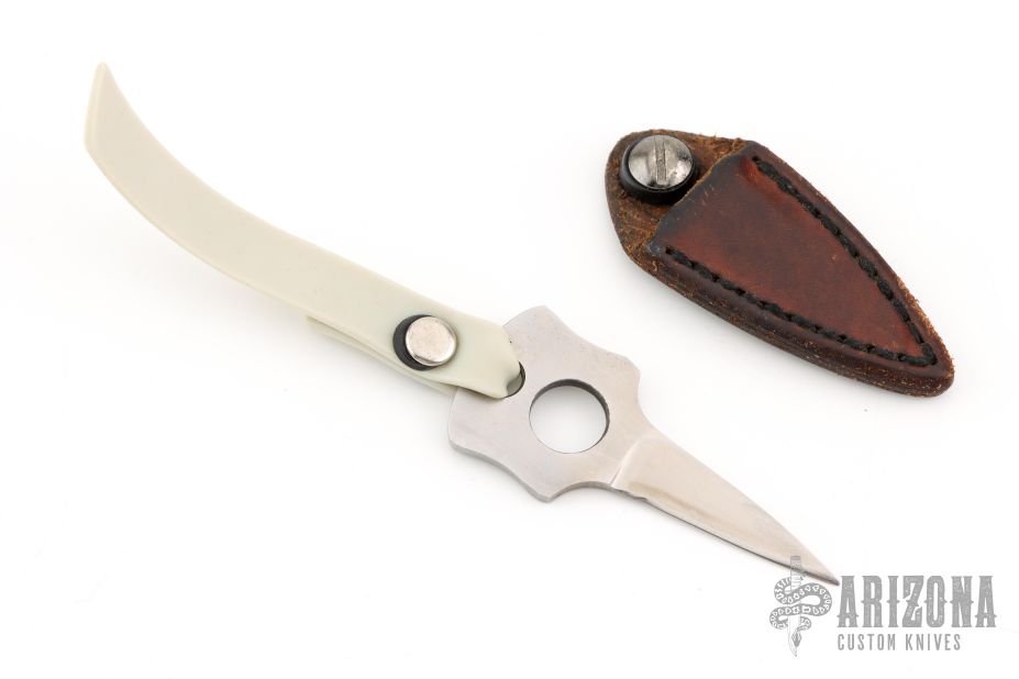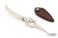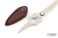 This single-edged lapel dagger by Crawford Knives has a satin finish, .123" blade stock and .519" blade depth. Comes with a kydex and leather sheath. #14 in the ricasso. Has some scuffs and scratches, great condition otherwise.
