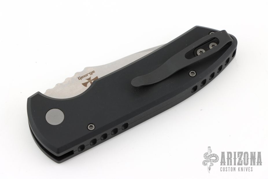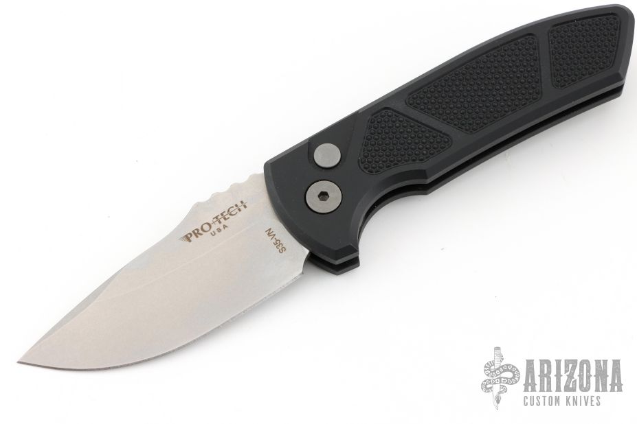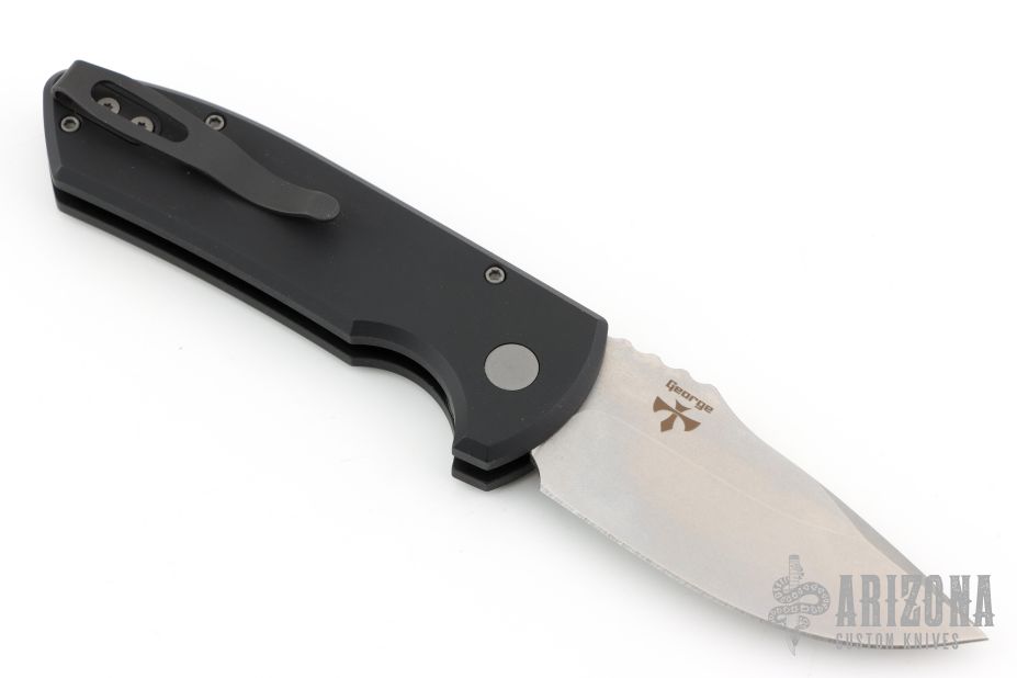 The Short Bladed Rockeye, or SBR for short, is a compact version of the outstanding full sized Rockeye Auto. Both knives are designed by Marine Corps knife designer Les George, who’s ergonomic hard use knives have been faithfully translated to automatic versions by Pro-Tech. The SBR features a compact design, with a 2.5″ blade that’s built for a multitude of cutting tasks. A pocket milled spine adds extra grip and depth to the design. The SBR features solid black hard coat anodized handles with grip textured milling, blasted hardware, black DLC coated deep carry clip, and a stonewashed blade. Includes the original box and papers. Excellent condition.