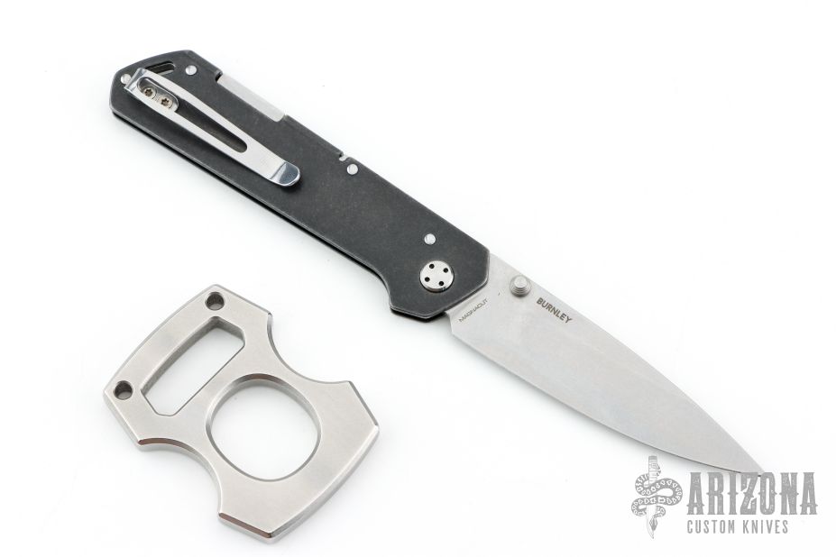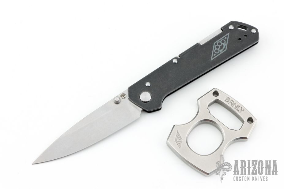This "Brawler Set" includes a Boker Kihon customized by Lucas Burnley with a Brawler club stamp, and a stainless steel cypop with .25" thickness, and a Brawler club stamp. Both are new in packaging.