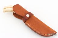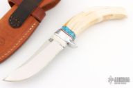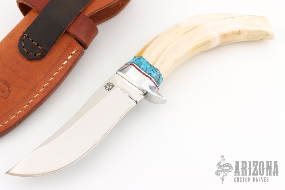 This Hunter by RD Nolen features a mirror polished blade with .194" blade thickness and 1.289" blade depth, hidden tang construction. The handle has a aluminum guard, warthog tusk grip with red/turquoise/aluminum spacers. Comes with a brown leather sheath and COA. Excellent condition.