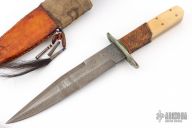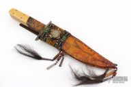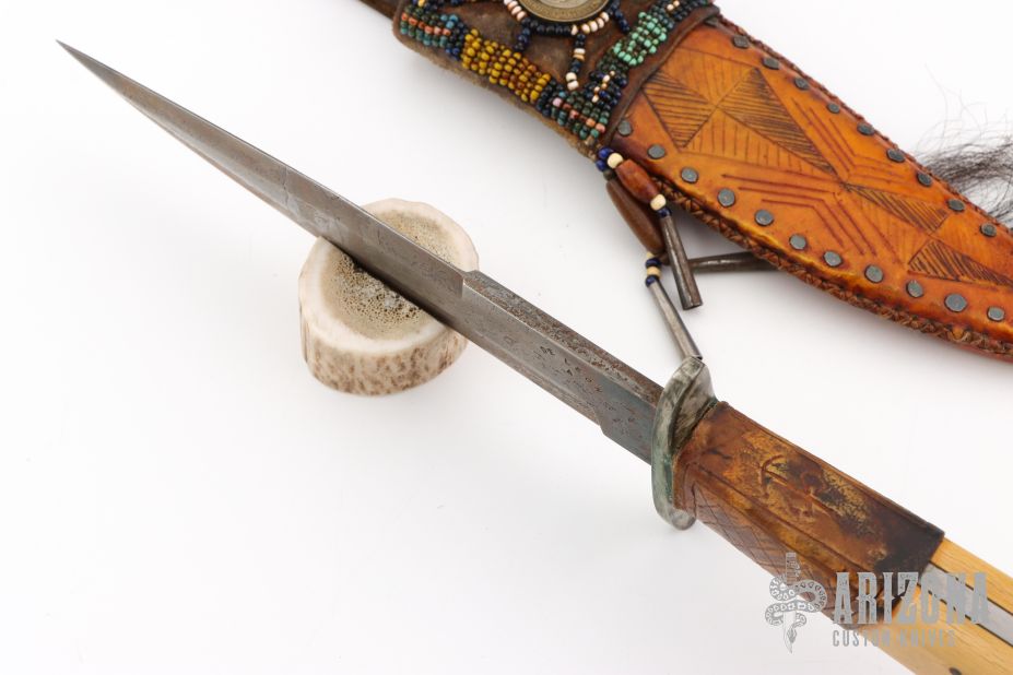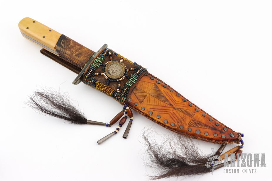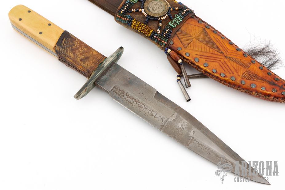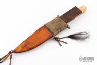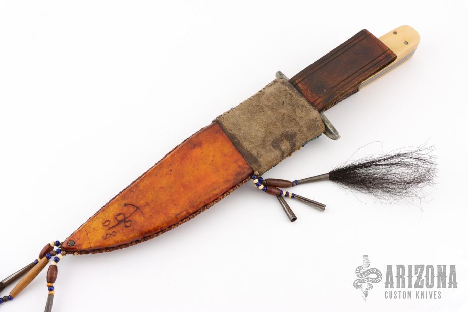 This Fighter by Enedino De Leon features a clip point blade with false top edge, .215" blade stock and 1.439" blade depth, full tang construction. The handle has an antiqued nickel silver guard, ivory paper micarta scales with black liners, tooled leather wrap below the guard. Comes with a beaded and hand tooled brown leather sheath with Mexican coin concho. Excellent condition.