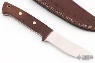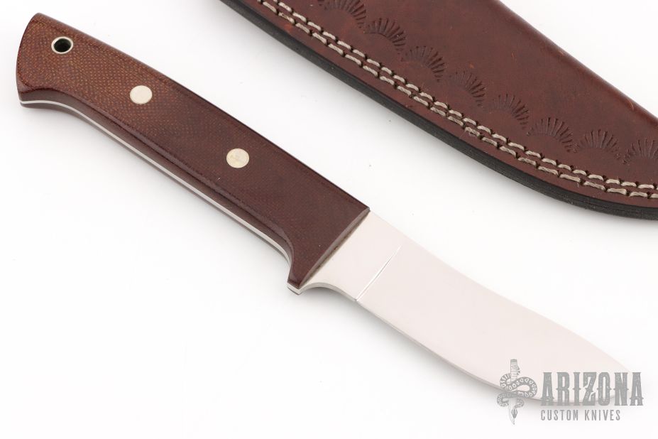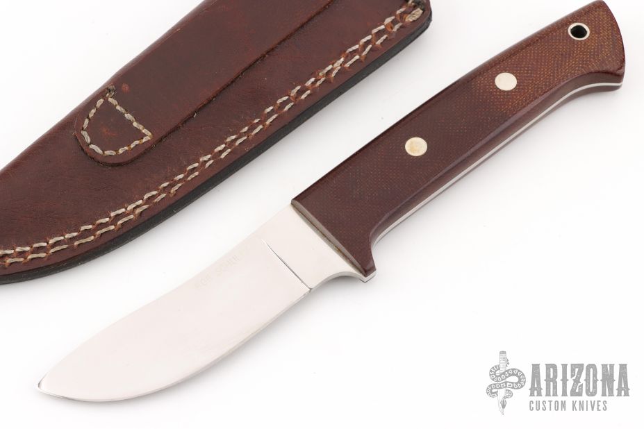 This Skinner by Bob Schultz features a satin finished blade with .099" blade stock and .998" blade depth, full tapered tang construction. The handle has brown canvas micarta scales with nickel silver pins. Comes with a hand tooled brown leather sheath. Excellent condition.