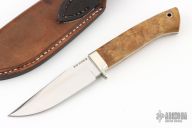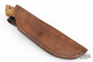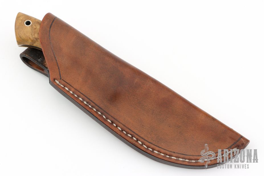 This hunter by Bob Schultz features a mirror finished clip point blade with false top edge, .157" blade stock and 1.119" blade depth, full tapered tang construction. The handle has nickel silver guard with wood scales, lanyard hole. Comes with a brown leather sheath. Excellent condition.