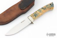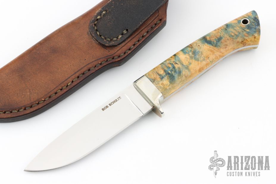 This hunter by Bob Schultz features a mirror finished clip point blade with .166" blade stock and 1.016" blade depth, full tapered tang construction. The handle has nickel silver guard with stabilized burl wood scales, lanyard hole. Comes with a brown leather sheath. Excellent condition.
