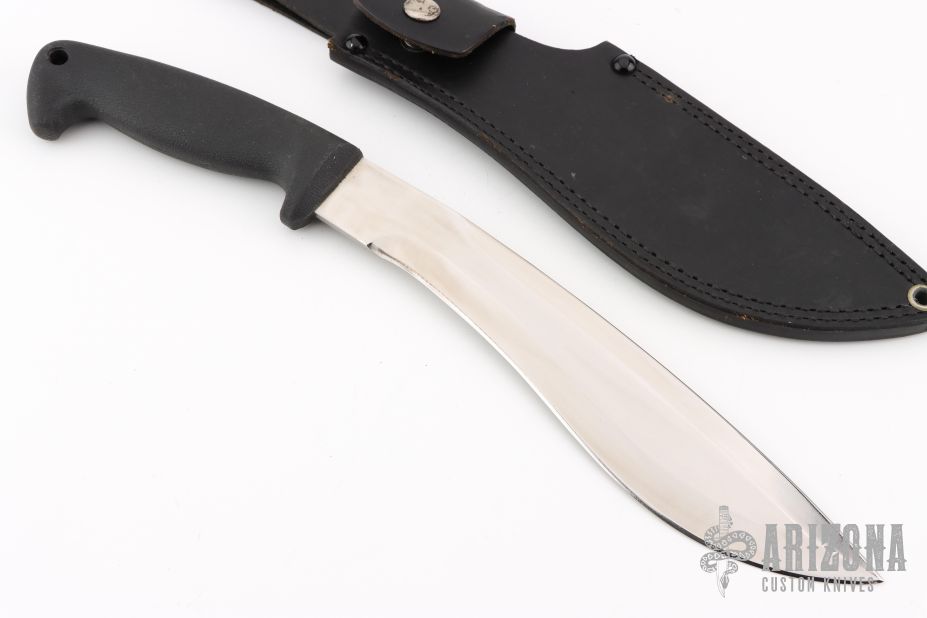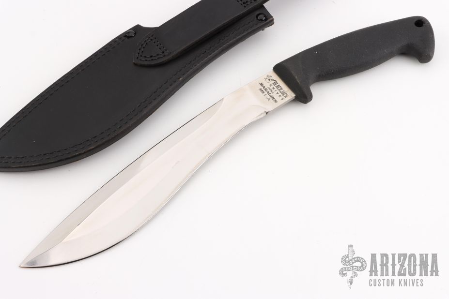This Marauder MK1 by Blackjack Knives features a high satin finished kukri style blade with false top edge, .179" blade stock and 1.729" blade stock, hidden tang construction. The handle is rubber with lanyard hole. Comes with black leather sheath and original box. Has some scratches, otherwise excellent condition.