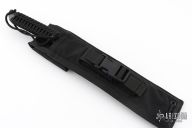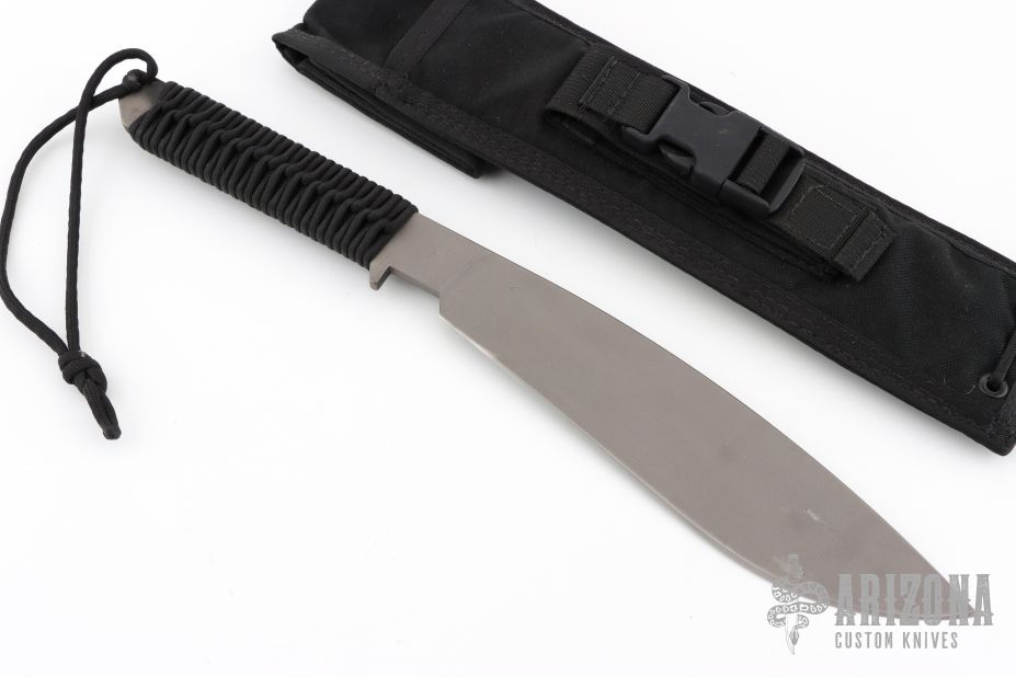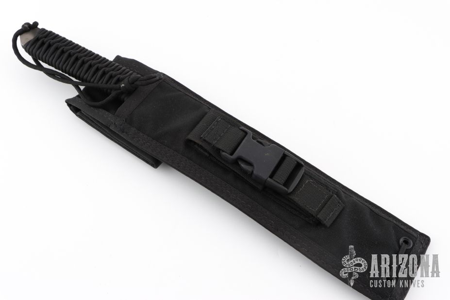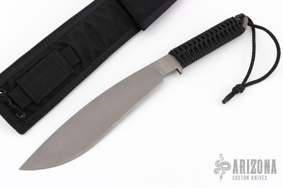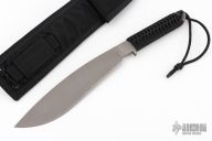 This PAB by Strider features a bead blasted blade with notched thumbrest and false top edge, .255" blade stock and 1.851" blade depth, full tang construction with paracord wrap. Comes with black nylon sheath with kydex insert. Has some sheath scuffs, otherwise excellent condition.