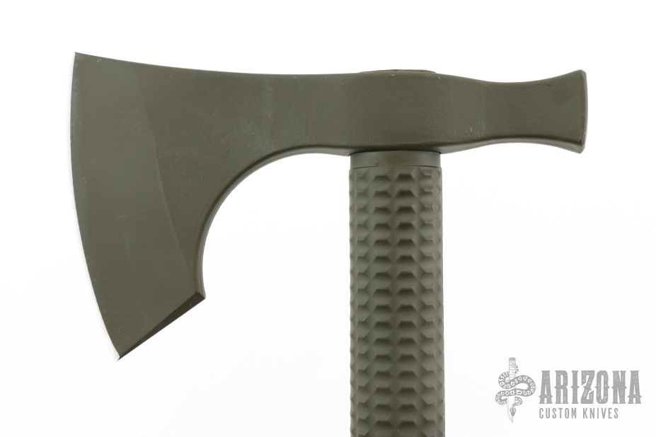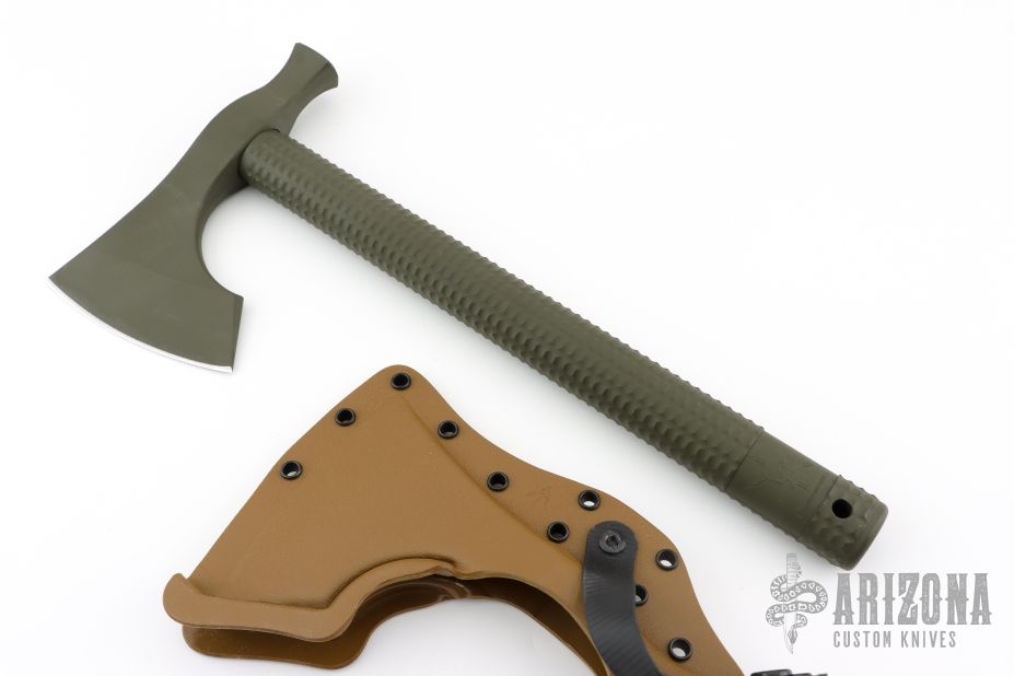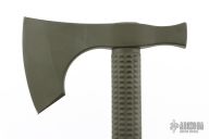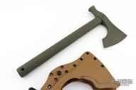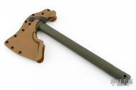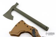 The Model 2 is a robust hammer poll tomahawk with an aggressive 4.125" cutting edge. Combine that with a straight handle makes it a well balanced tool that offers incredible cutting capability. In addition to the sharpened main edge, the Model 2 has a true hammer at the back of the head making it a great companion around camp. The bearded design allows for a high grip, facilitating more accurate fine motor skill work. The Model 2 features a black powdercoat finish for corrosion and wear resistance. Included is a bottom-eject, molded Coyote Brown kydex sheath and low-ride M.O.C. straps for belt carry.