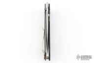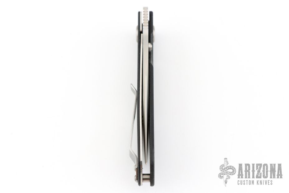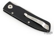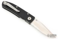 This Model ACC-MS is a Walker Design with a satin finished partially serrated blade and black G-10 scales, titanium liner, tip up stainless steel clip. Nice detent, lockup and blade seating. Excellent condition.