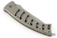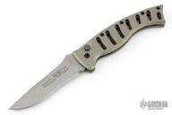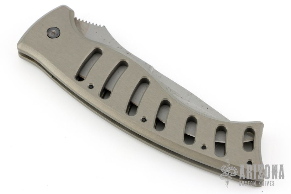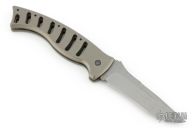 This Paragon X-O Lite auto has a bead blasted recurve blade with notched thumbrest and false top edge. Handle is anodized aluminum with a push button. Has some light oxidation on the blade, otherwise good condition.