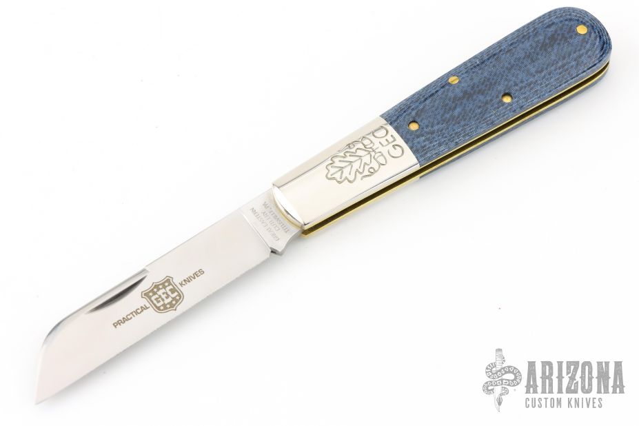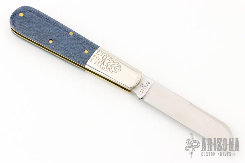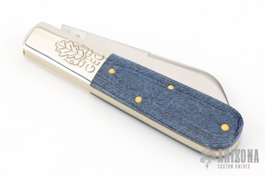 This Barlow from Great Eastern Cutlery features a satin finished clip point style blade with nail nick and swedge. The handle has nickel silver bolsters, blue denim micarta covers over brass liners and stainless steel spring. Has Half-stop. Comes with original tube. Excellent condition.