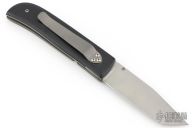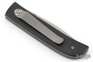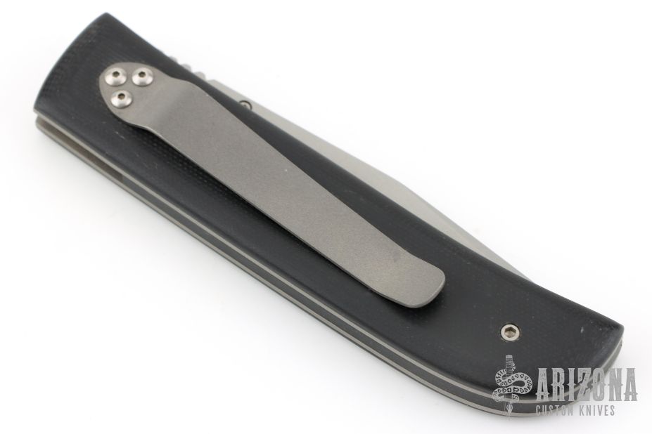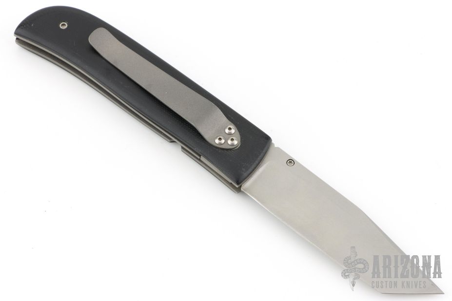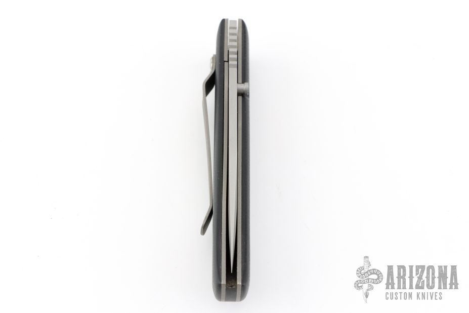 This linerlock from Jeff Chaffee features a bead blasted tanto blade with a single thumbstud. The handle has black G-10 with a bead blasted titanium liners and tip down pocket clip. Has a couple light scuffs, otherwise excellent condition. Dated 1996