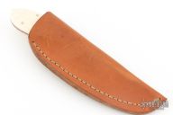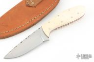 This drop point hunter features a hand rub satin finished blade with .183" blade stock and 1.37" blade depth, full tapered tang construction. The handle has pinned bone scales with red liners. The blade spine and belly has been file-worked. Comes with a leather belt sheath. Has some scratches, excellent condition otherwise.